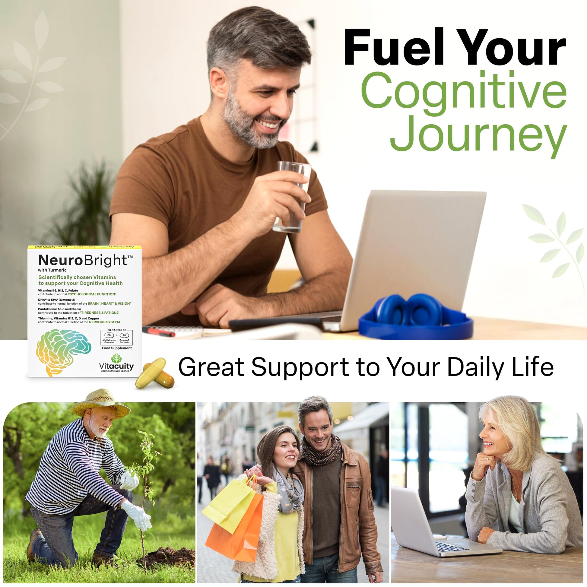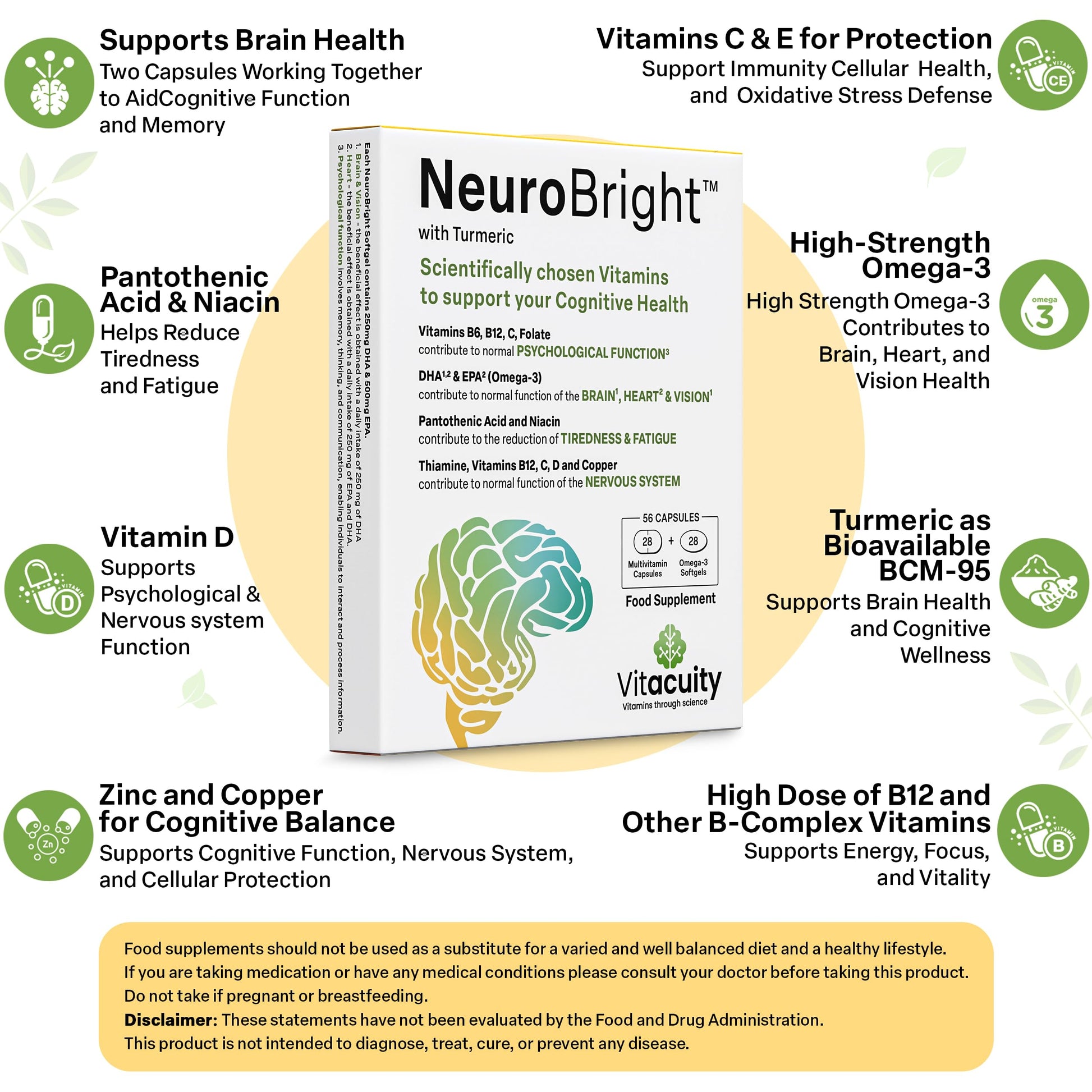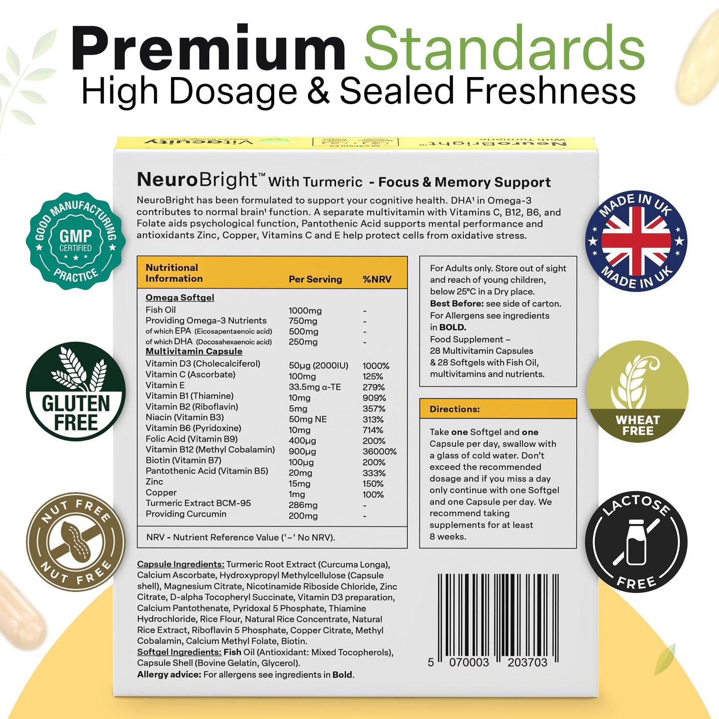 Vitacuity NeuroBright Fish Oil Omega 3 Supplements + Multivitamin Brain Supplements for Memory and Focus – 17 High Dose Minerals, Vitamin B Complex, Vitamins C, D, E, Turmeric Curcumin, 28 + 28 (56 Capsules)