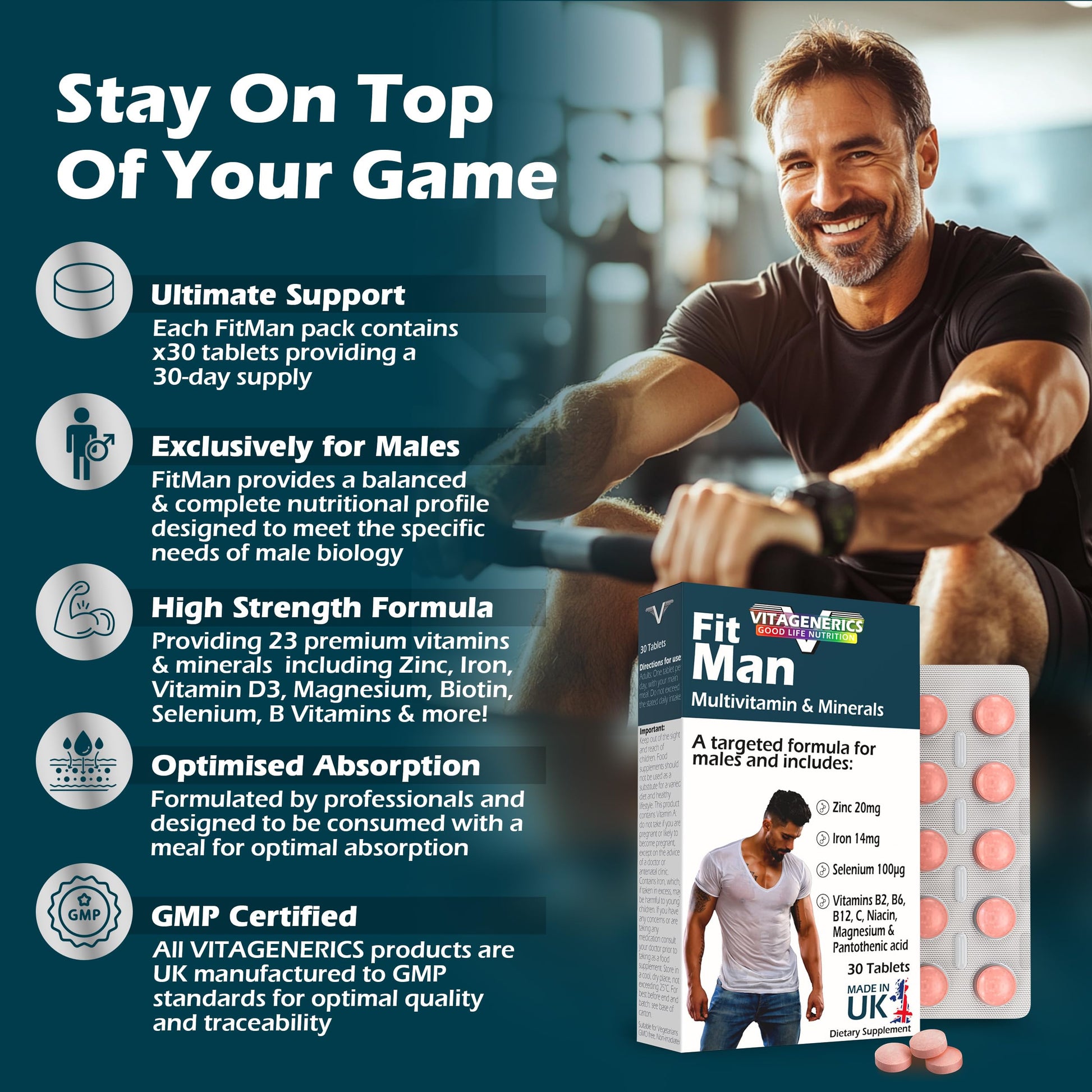 VITAGENERICS FitMan High Strength Multivitamin & Minerals | x30 Tablets | 23 Essential Vitamins & Minerals including Zinc, Iron, Biotin, Vitamin D3, Calcium, Magnesium, B-Complex. UK Made for MenMore Info
