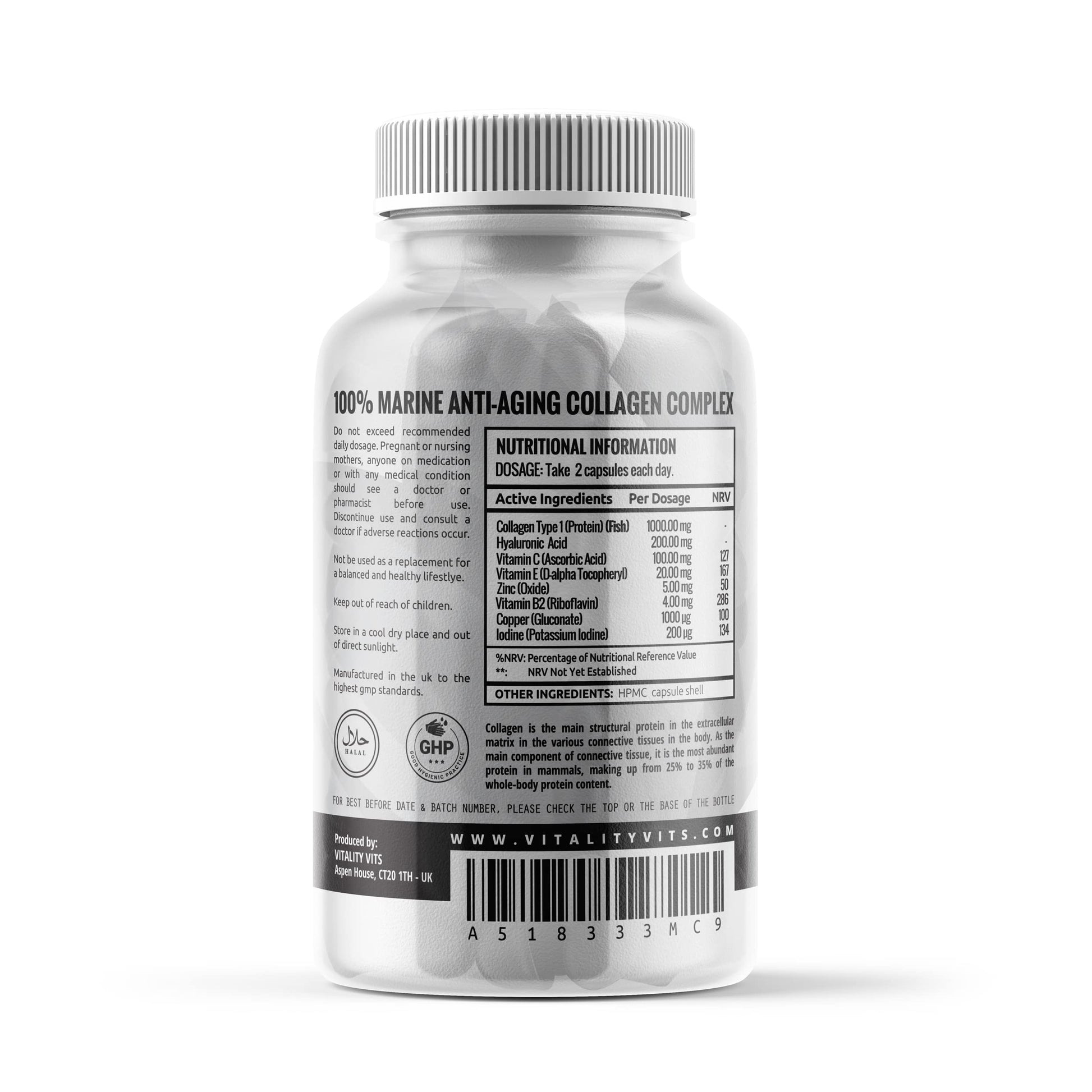 VITALITYVITS Marine Collagen Complex - High Strength Capsules for Hair, Skin, Nails & Joint Support - Vitamins B2 C & E