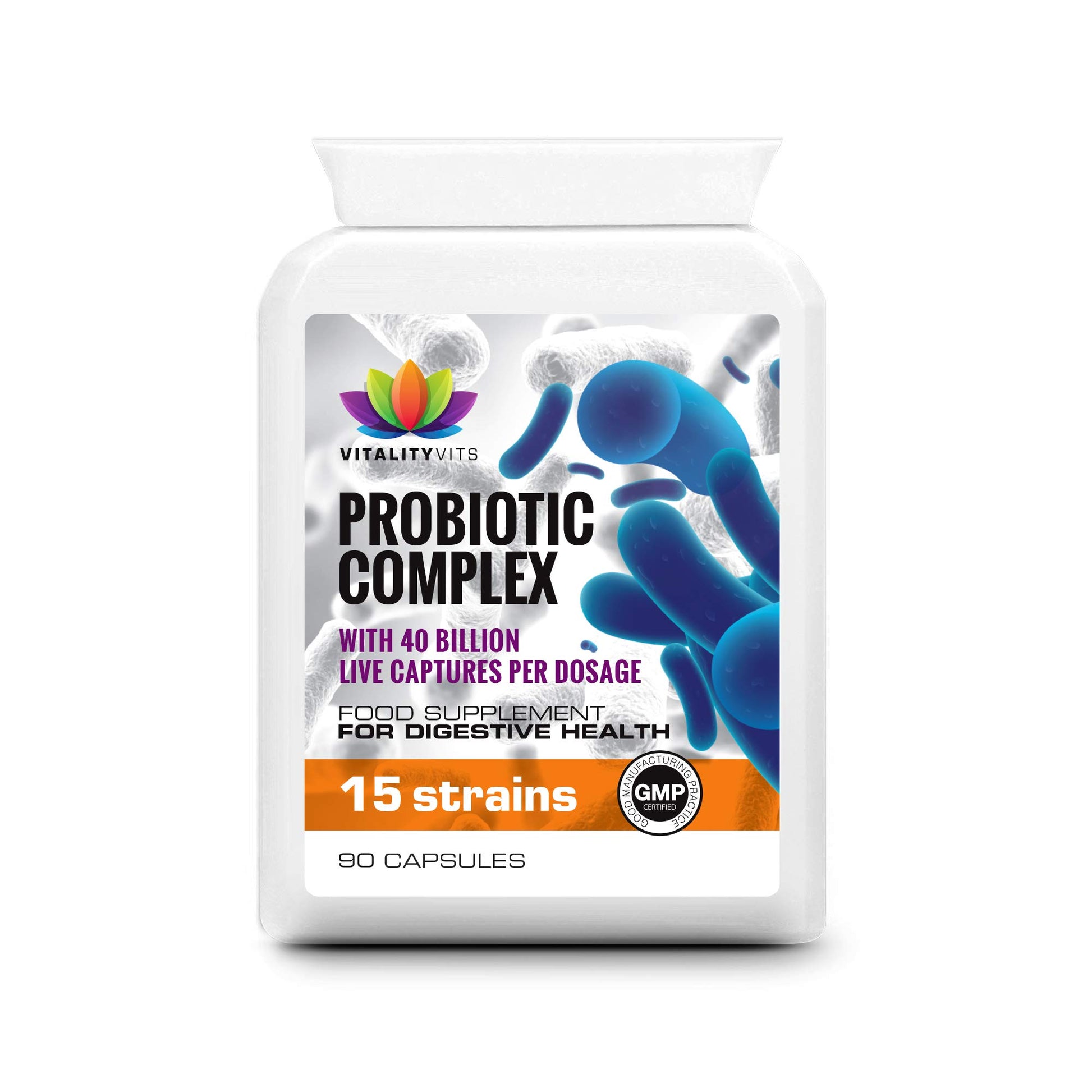 VITALITYVITS Probiotic Complex – Digestive Health – 40 Billion CFU – 15 Bacteria Strains - High Potency MAX Strength - Acidophilus Capsules (90 Capsules)