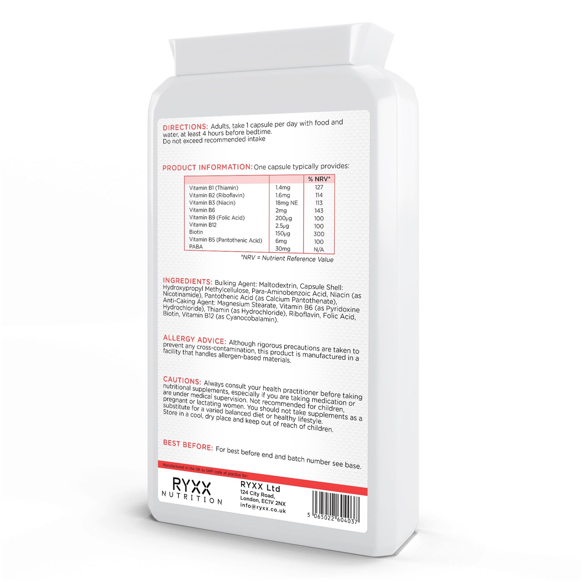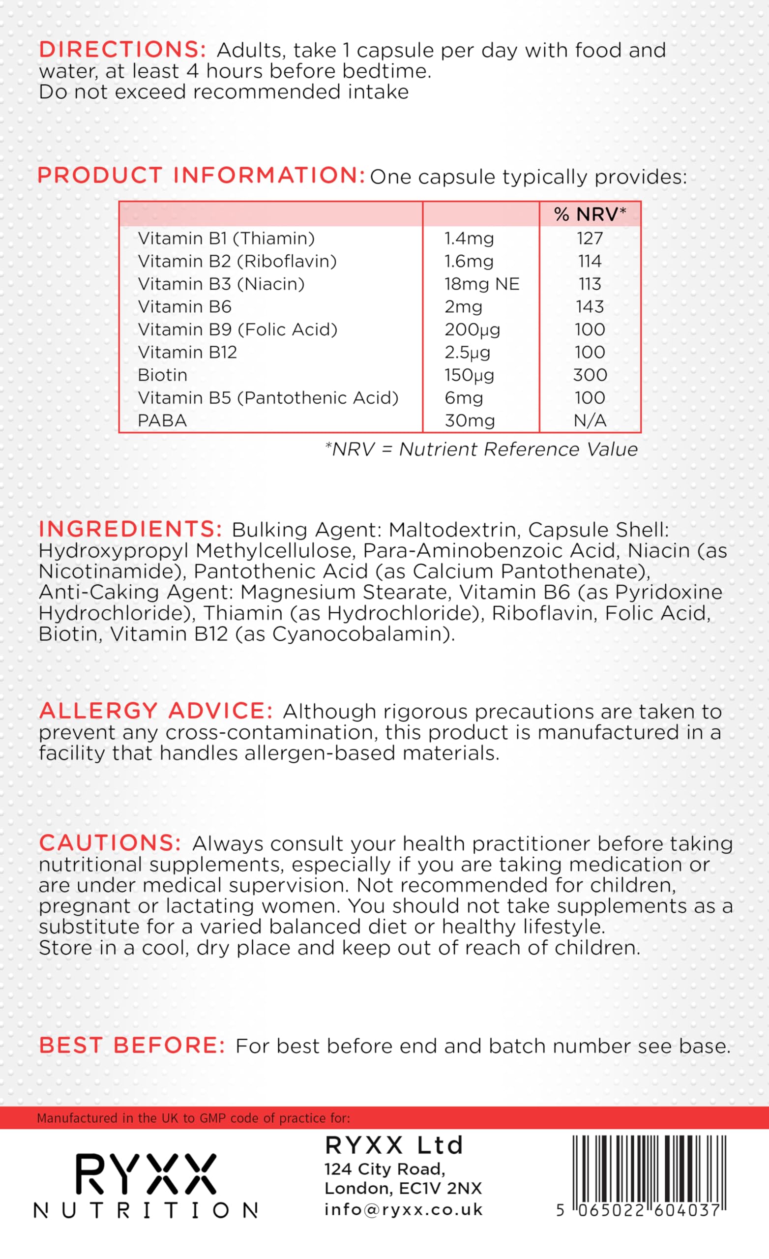 Unlock the full potential of your health with RYXX Vitamin B Complex +, meticulously crafted to provide you with a high-strength Vitamin B formulation containing all 8 essential B vitamins for optimal wellness. Contributing to the reduction in tiredness and fatigue as well as overall immune system support. Our expertly formulated Vitamin B Complex high strength formula features a powerhouse blend of nutrients, including methylated forms of Folate, B6, and B12, designed to enhance absorption and potency. Making it one of those vitamins women and men should certainly look to add to their daily routine. Contains: Vitamin B1 , Vitamin B2 (Riboflavin), Vitamin B3 (Niacin), Vitamin B6 , Vitamin B9 (Folic Acid), Vitamin B12 Biotin, Vitamin B5 (Pantothenic Acid), PABA. This multi vitamin complex provides a convenient, all-in-one alternative to other B12 spray products, folate supplements, inositol tablets, B6 vitamins, B12 liquid and other multivitamin tablets. Packed into vegan capsules and made in the UK, this product not only supports your nutritional goals but also aligns with ethical choices, one of the perfect supplements for women and men no matter you dietary preferences. We've enriched our complex with folic acid, a crucial element especially vital for women’s health, supporting prenatal care and overall cellular function. What sets us apart from other brands like Solgar or Vitabiotics Ultra is our dedication to effective bioavailability through methylation technology—ensuring that each capsule works efficiently within your body. Our selection caters not only to vegans but also to individuals seeking targeted health solutions such as choline for brain productivity or benfotiamine known for nerve support. Whether youre looking at Centrum Men for daily vitamin reinforcement or considering Healthspan alternatives — choose RYXXs unparalleled Vitamin B Complex high-strength tablets as your go-to nutritional partner. Make a vibrant lifestyle accessible today!More Info