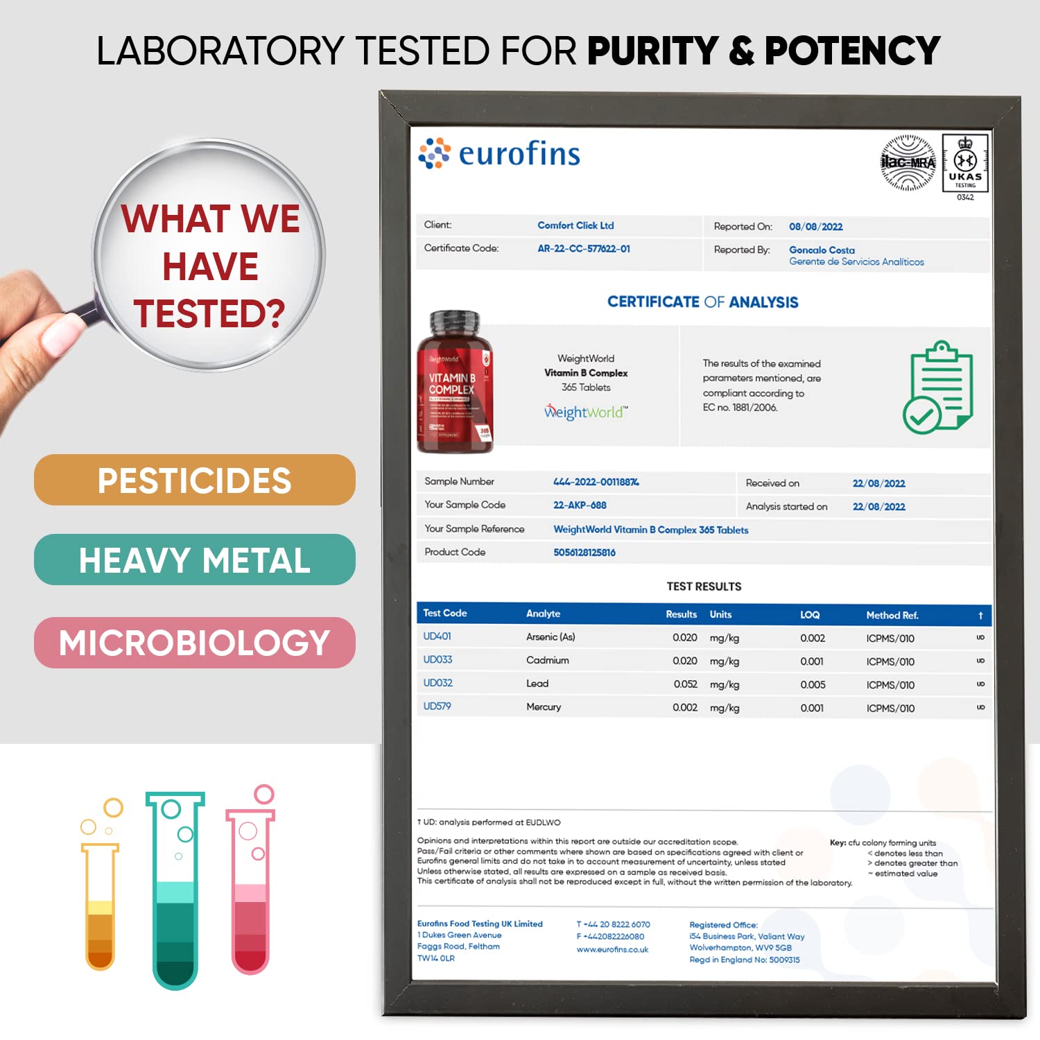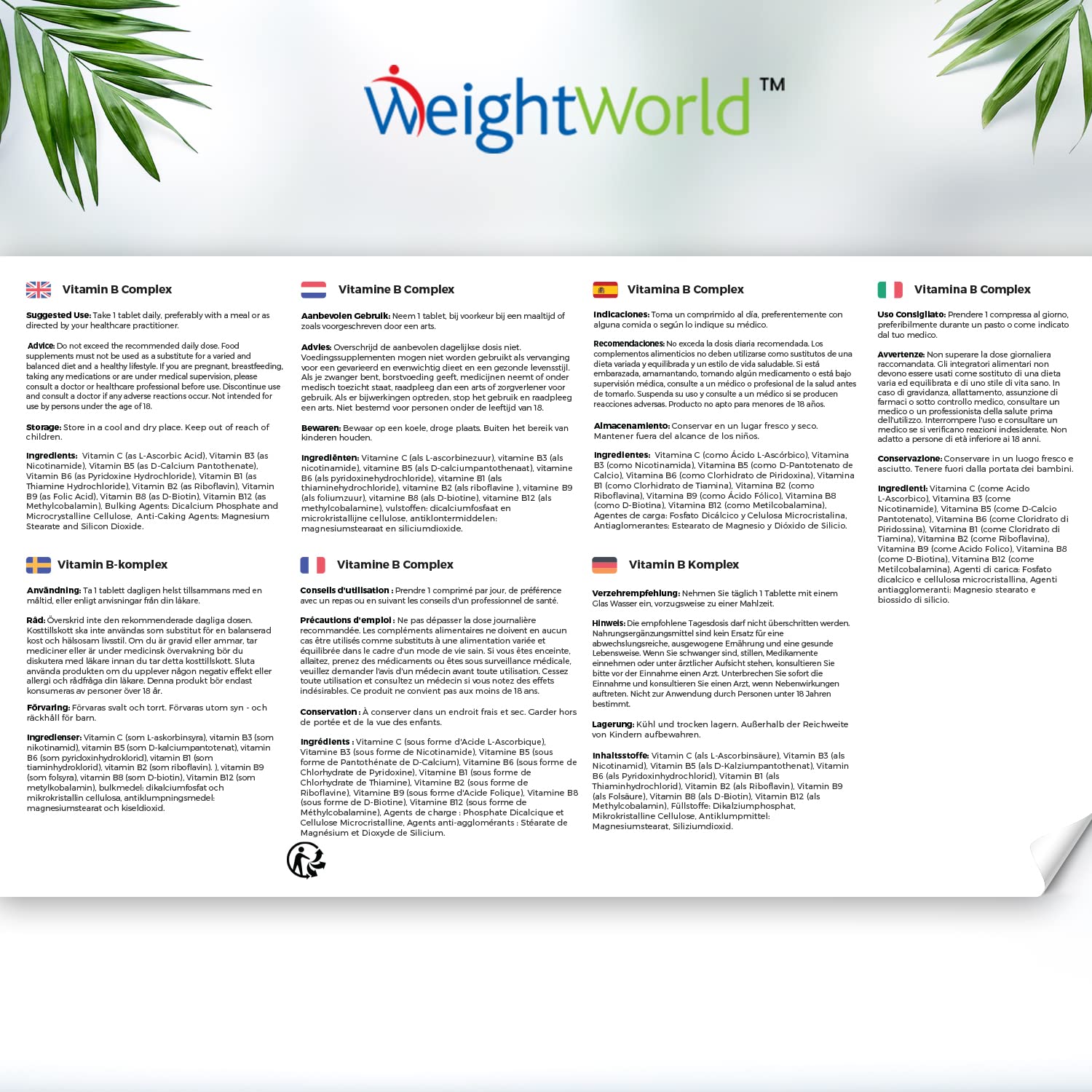 HIGH STRENGTH VITAMIN B COMPLEX WITH VIT C - Every tablet of WeightWorld's Vit B Complex contains a proprietary blend of 8 B Vitamins: Vitamins B1 (Thiamin), B2 (Riboflavin), B3 (Niacin), B5 (Pantothenic Acid), B6 (Pyridoxine Hydrochloride), B7 (Biotin), B9 (Folic Acid), and B12 Vitamin (Methylcobalamin). Furthermore, our Vitamin B tablets comes with high strength vitamin C for added benefits.ENERGY, IMMUNE SUPPORT & OVERALL HEALTH SUPPLEMENT - Riboflavin (Vitamin B2) contributes to normal energy-yielding metabolism. Biotin contributes to the maintenance of normal hair and skin. Vitamin B12 contributes to normal functioning of the nervous system and psychological function. Vitamin B12 contributes to the reduction of tiredness and fatigue and to normal function of the immune system. (EFSA).FULL YEAR SUPPLY OF SUPER B COMPLEX TABLETS - Our each bottle of B complex vitamins high strength contains 365 micro-tablets, so you won't need to re-order again for at least a year. Also, you no more need to buy biotin tablets, folic acid tablets, folate supplements or B12 supplement or immune system vitamins separately, our Vitamin B Complex delivers all the essential vitamins into one.BRITISH MADE, HIGH QUALITY - Our high potency Vitamin B complex is made RIGHT HERE in the UK in GMP certified facilities, so you are safeguarded by the highest standards in the world. Our vegan vitamin b complex is free of GMOs, artificial colours, flavours and allergens such as Gluten, Wheat, Lactose, Nuts and Nut Traces.WHY CHOOSE WEIGHTWORLD? - A British grown family business with over 15 years of experience in health and wellness supplements and devices, we have dedicated ourselves to sourcing the highest quality natural ingredients and safe electrical components for our customers. We create UK Made, GMP certified products aimed at promoting a healthier body & mind for you and your family.More Info