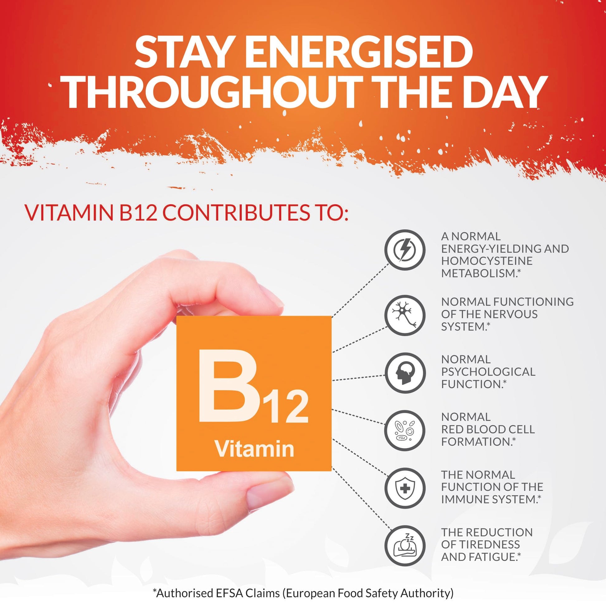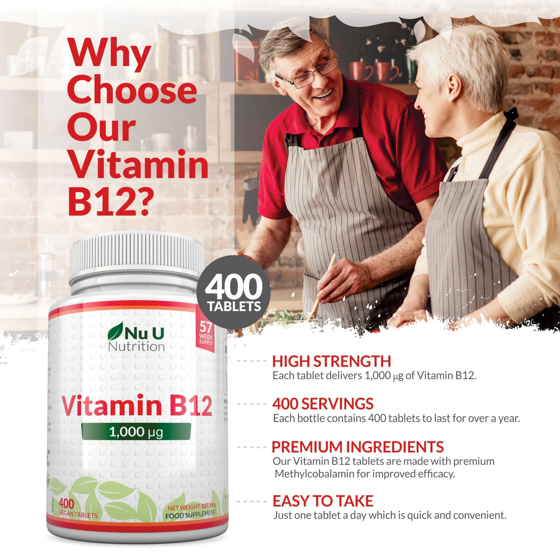 Why take Vitamin B12?Vitamin B12 is an important water-soluble vitamin which is vital to our bodies. Vitamin B12 contributes to: normal energy-yielding metabolism; normal functioning of the nervous system; normal homocysteine metabolism; normal psychological function; normal red blood cell formation; the normal function of the immune system; to the reduction of tiredness and fatigue; and has a role in the process of cell division. * * all claims are substantiated by the European Food Safety Authority (EFSA).Vitamin B12 deficiency is common so it is recommended to supplement your diet with a good B12 food supplement.Why buy Nu U Nutrition Vitamin B12 10000μg?100% MORE - Receive 400 tablets per bottle with our B12 supplement rather than the 180 offered by most other supplements. HIGH STRENGTH - Nu U Nutrition’s Vitamin B12 contains 1000μg of highly bioavailable Methylcobalamin per tablet.FREE FROM ALLERGENS & ADDITIVES - For increased peace of mind, our tablets contain no harmful additives, are free of sugars and sweeteners and free of allergens including gluten, lactose, soy, eggs, crustaceans and nuts.NO RISK - We want you to be satisfied with our products, we offer no-questions-asked.PREMIUM QUALITY- Our manufacturing is compliant with recognised global industry practices including: GMP, HACCP, ISO 9001 & Global Food Safety standards, giving you the ultimate peace of mind.More Info
