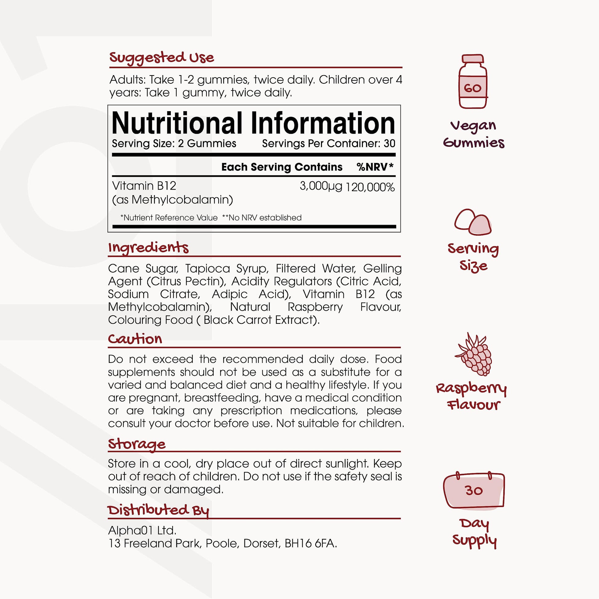 Vitamin B12 is an essential vitamin that supports many bodily functions and processes. It is especially important for vegetarians and vegans since the main sources are from animal products. Providing a mighty 1500mcg of vitamin B12 in every serving, these Alpha01 gummies are delicious, convenient, and 100% vegan friendly! Vitamin B12 plays a significant role in energy production by helping the body to convert energy from food, and helps to reduce feelings of tiredness and fatigue. It also helps to prevent anaemia by supporting red blood cell formation, supports a healthy immune system, and contributes to normal psychological function, including concentration, learning, memory and reasoning. Always fair trade and non-GMO, this supplement is made from premium ingredients sourced in Europe and meets all food safety requirements.More Info