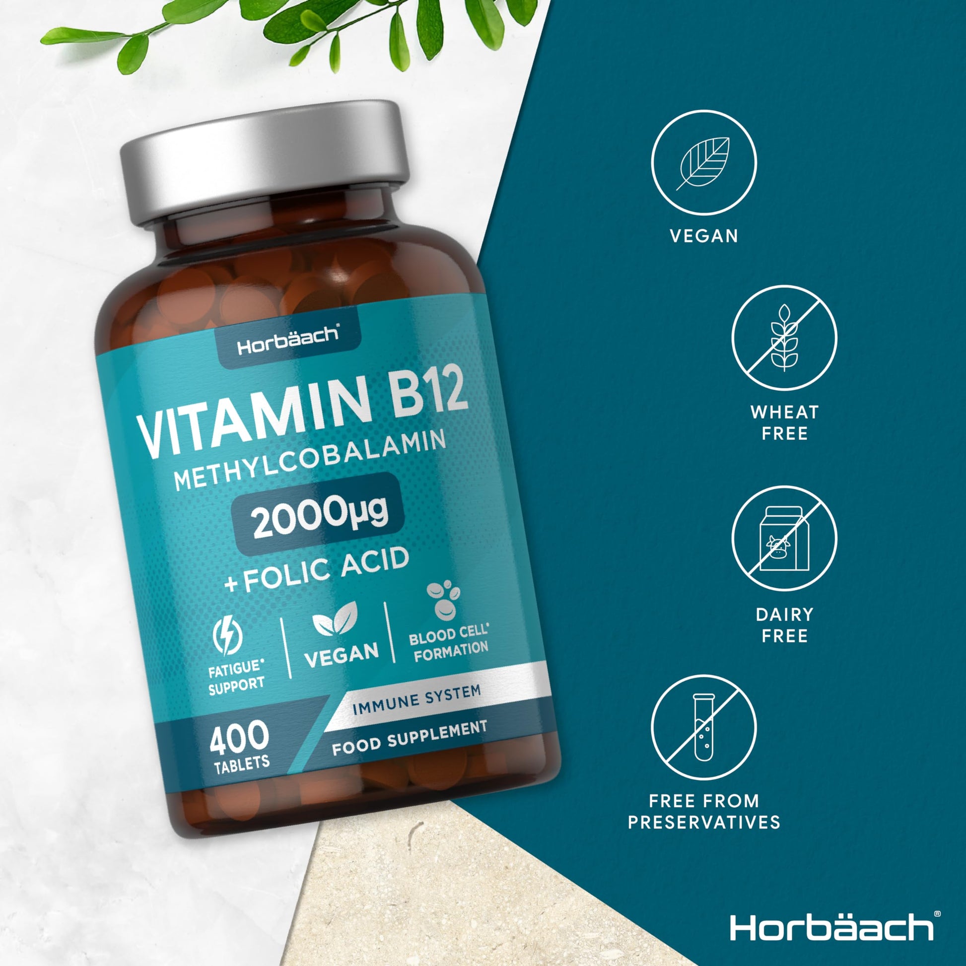 Vitamin B12 Tablets | 2000mcg | 400 Vegan Tablets | High Strength Supplement | Complex Formula with Folic Acid | by Horbaach
