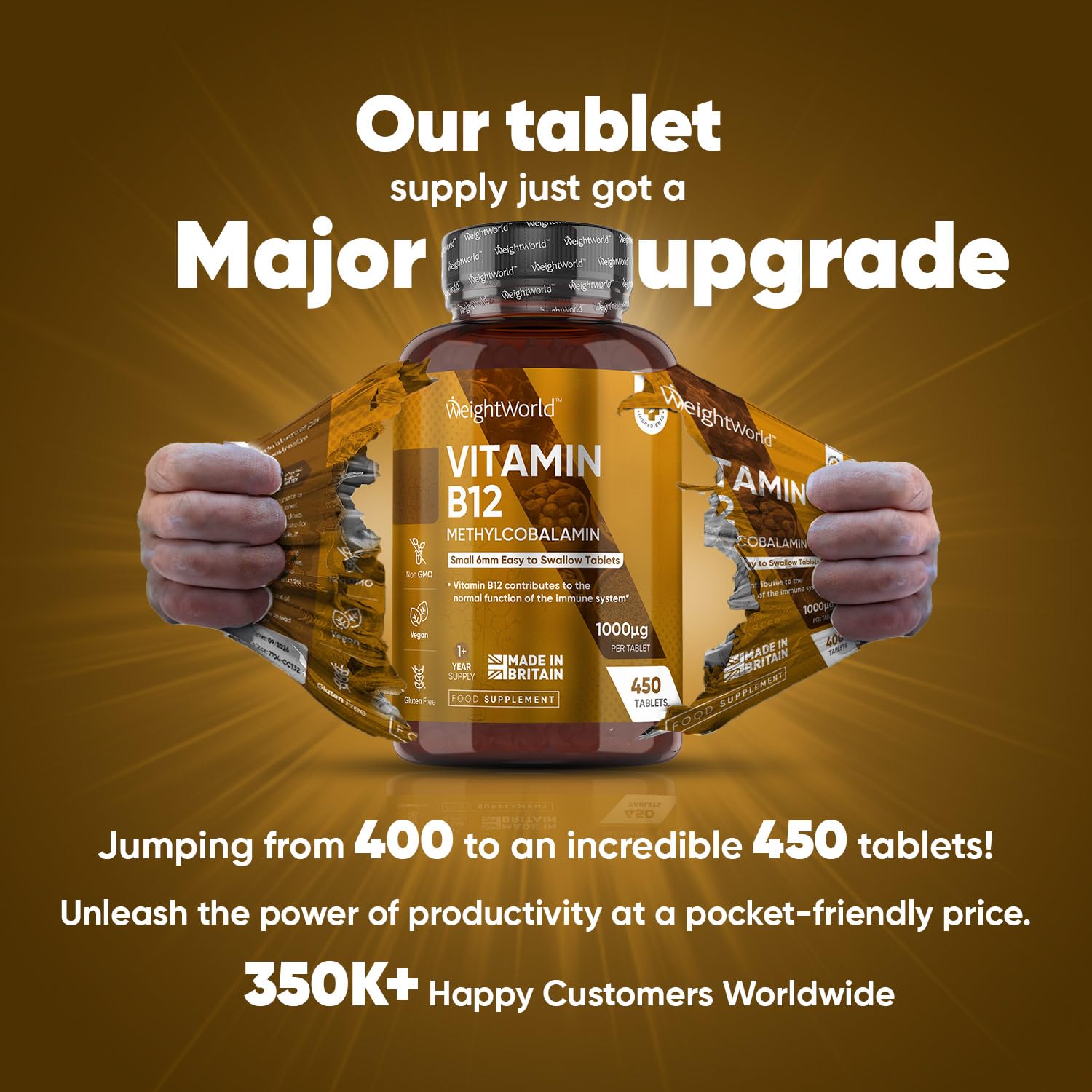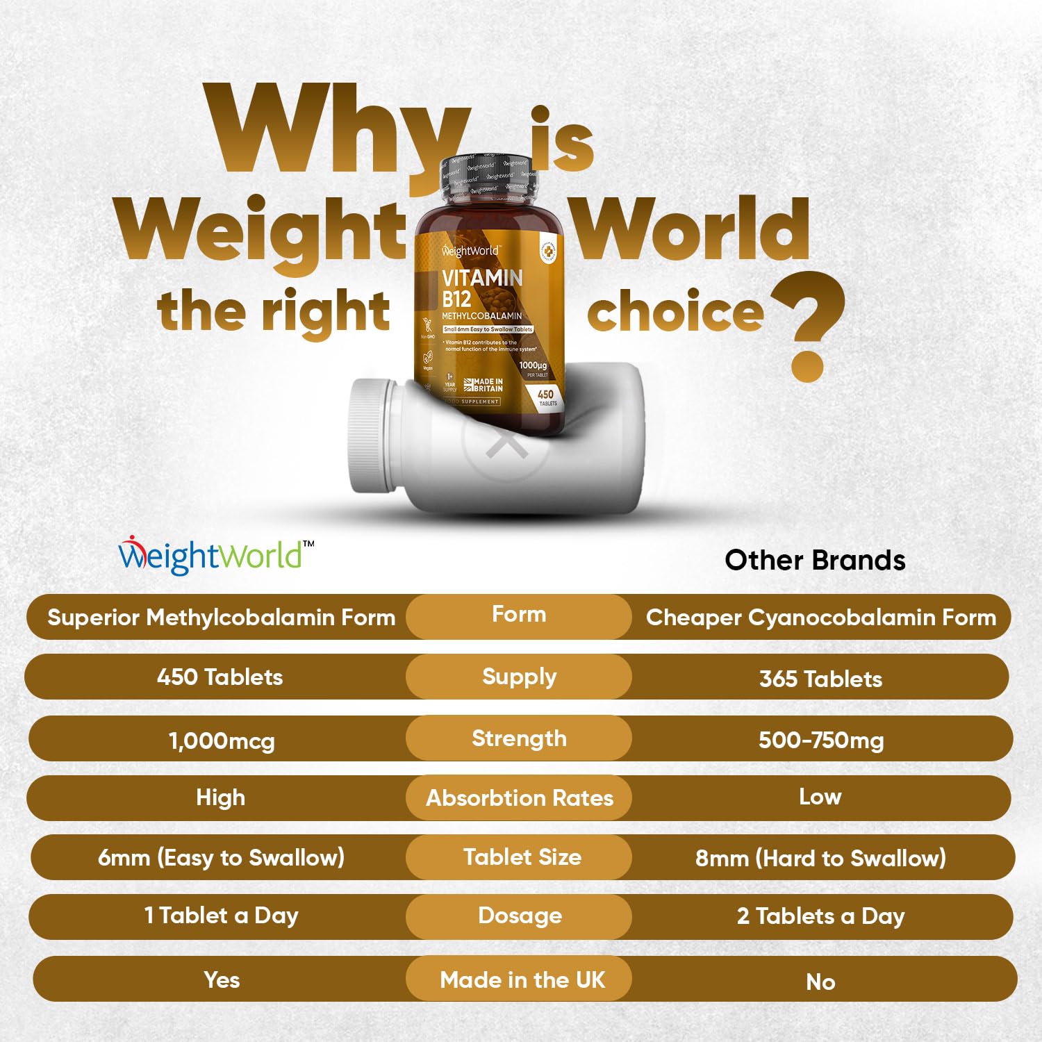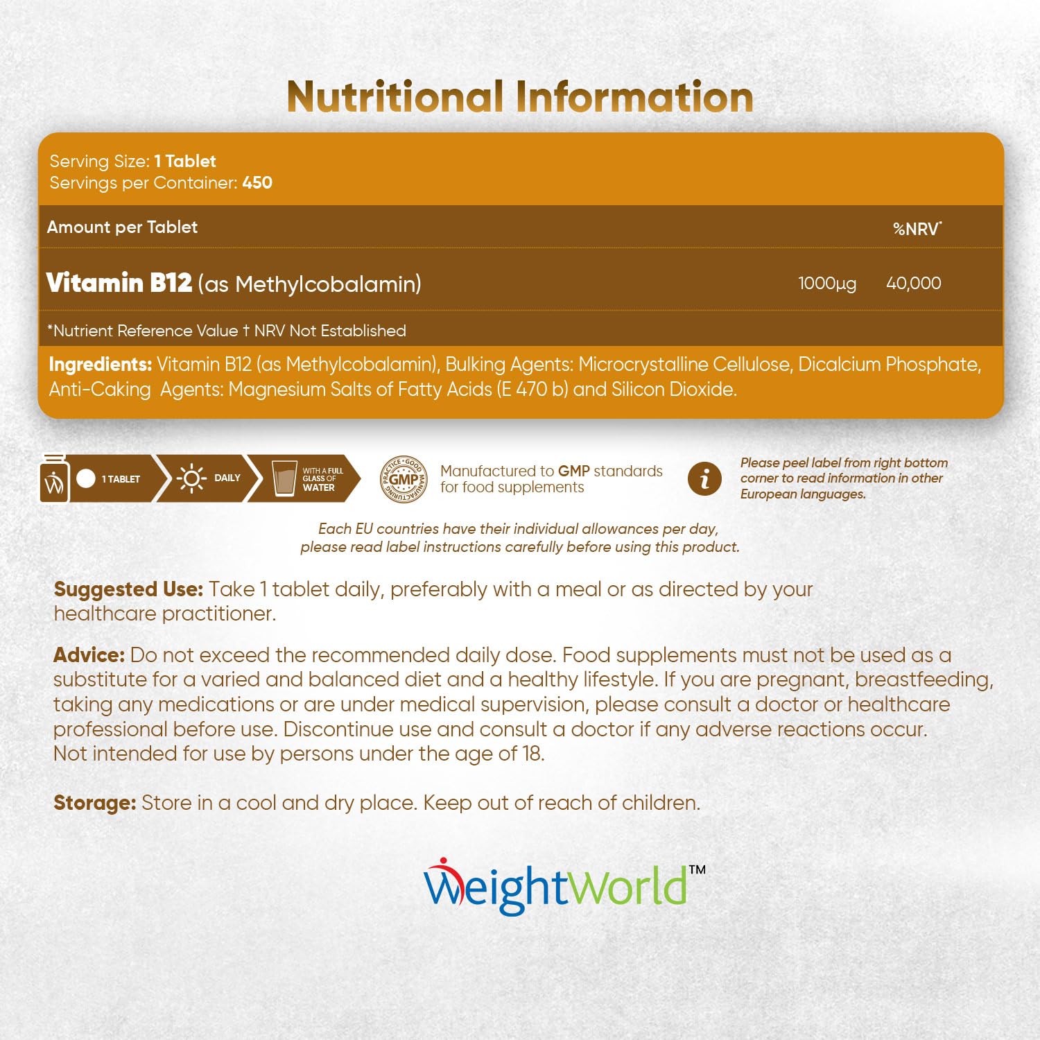 WeightWorld's Vitamin B12 1000mcg tablets contain Vitamin B12 Methylcobalamin, the most active and readily absorbed form of Vit B12. Each easy-to-swallow 6mm tablet providing 1000mcg Methylcobalamin (40,000% NRV) aims to enhance energy levels and support brain health. The 450-tablet bottle of our Vitamin B12 Complex ensures a supply lasting you for over a year, promoting the maintenance of healthy B12 levels with just one daily tablet. Vitamin B12 is needed for numerous metabolic processes that occur in our bodies. Since the body can't store B12, it must be supplied regularly. B12 Vitamin is found in shellfish, meat & dairy products, making it challenging to maintain B12 levels from diet alone, especially for vegans & vegetarians. Our Vitamin B12 high-strength supplement & immune system booster is 100% vegan & vegetarian friendly. Our Vitamin B12 High-Strength supplements are here to make life easier. Vit B12 contributes to normal energy-yielding metabolism, psychological function, and red blood cell formation, & has a role in cell division. Also, B12 Vitamins contribute to the normal part of the immune system as well as the nervous system and the reduction of tiredness & fatigue (EFSA). B12 supplements are often used in fatigue and tiredness vitamins for men & women. We take pride in using top-quality ingredients. Our B12 Supplements are free from artificial flavours or sweeteners to ensure we provide optimal, healthy, healthy vitamin choices. They are gluten-free, allergen-free and non-GMO. We know that dietary supplements have distinct effects on everybody and hence offer a money-back guarantee if our Vit B12 high strength is not suitable for you.More Info