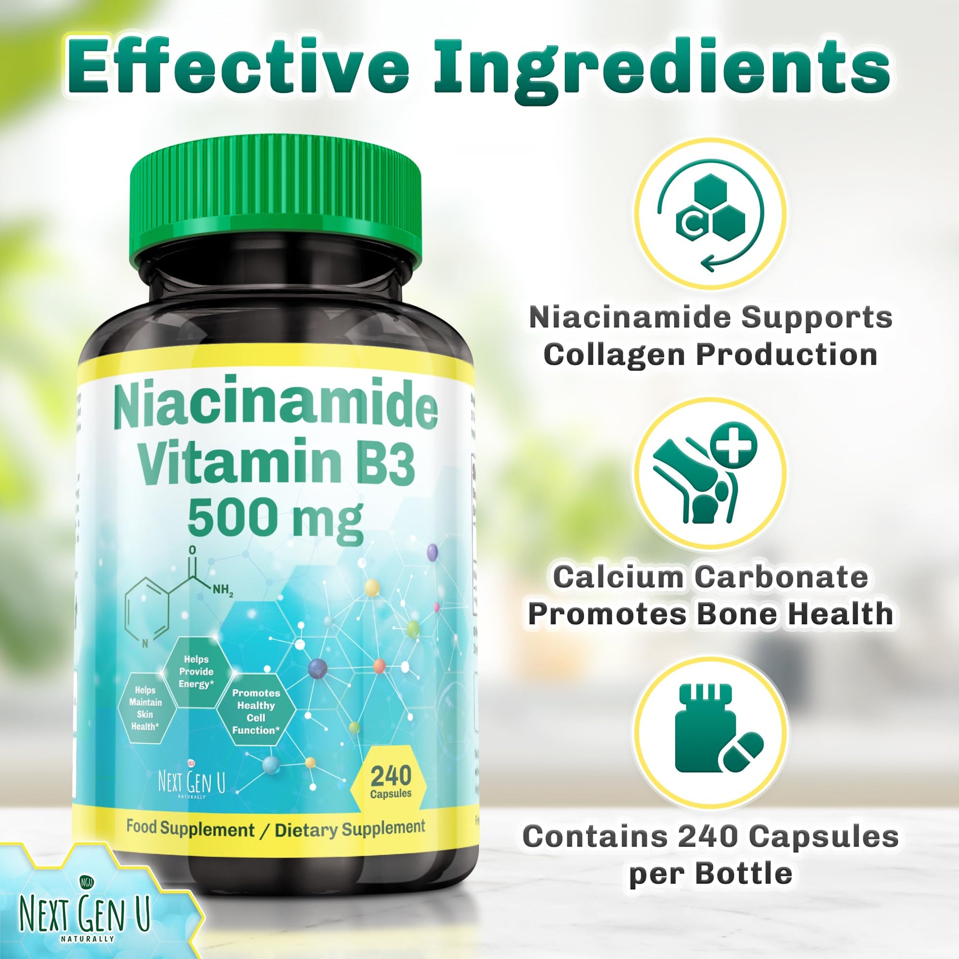 Vitamin B3 500 mg 240 Capsules Niacinamide Dietary Health Food Supplement for Flush Free Skin by Next Gen U