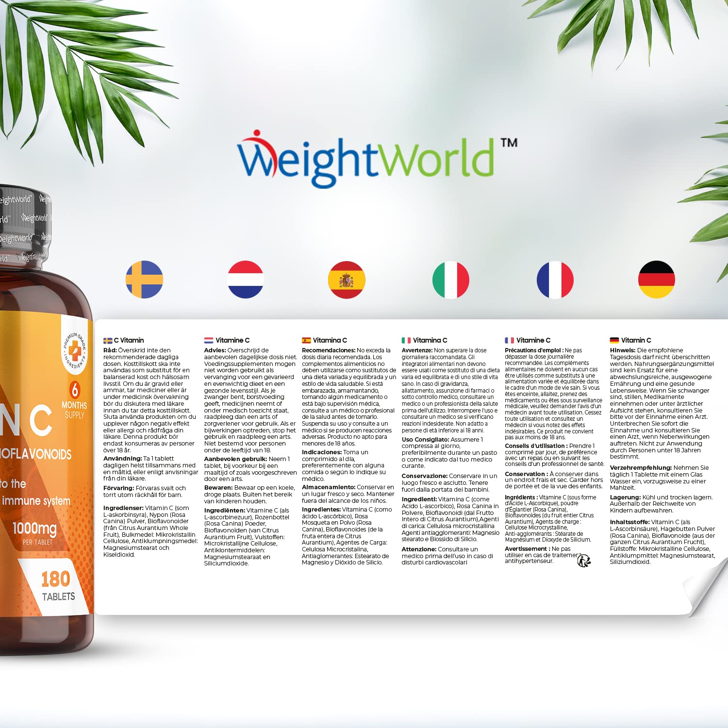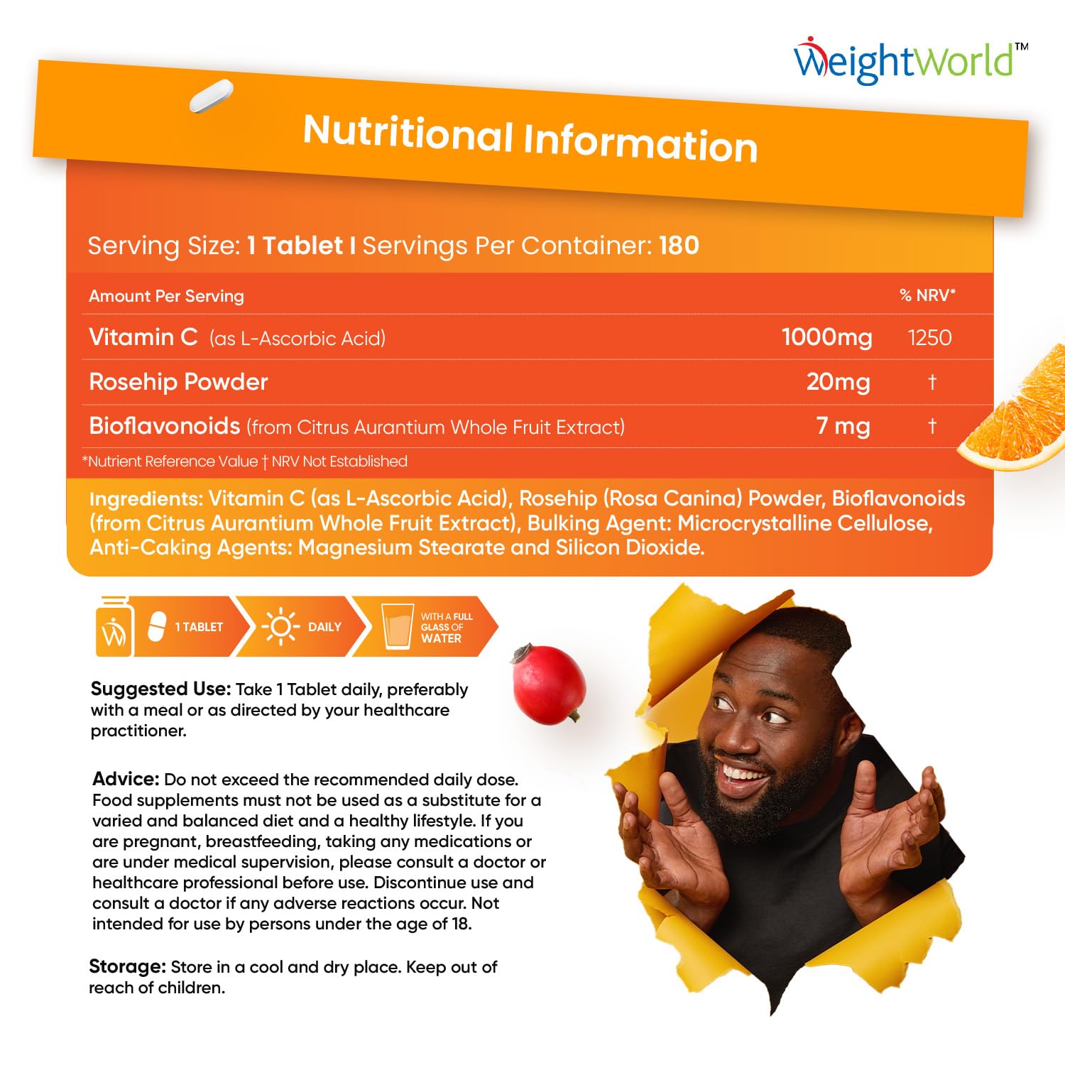 WeightWorld Vitamin C tablets with rosehip and flavonoids 1000mg tablets help you in ensuring that you are getting enough vitamin C. Our high-strength vitamin C supplements contain 1,000mg of Vitamin C, blended with naturally occurring plant pigments - Rosehip and citrus bioflavonoids to enhance the absorption & bioavailability. Vitamin C, hair, skin, and nail vitamins for women, also known as ascorbic acid or vitimin and vitamin c tablets 1000mg, are essential for any diet. It is well-known as an antioxidant vitamin for its ability to help protect cells against oxidation damage. High-strength vitamin C tablets also maintain healthy collagen levels in the skin, gums & joint cartilage. Vitamin C 1000mg contributes to the maintenance of the standard immune system. Other added benefits include the reduction of tiredness and fatigue as it increases iron absorption to help carry oxygen throughout the body(EFSA claims). Suppose you are looking for ways to improve your nutrition and finding it challenging to get the right amount of vit c tablets through food. In that case, our easy-to-take energy tablets for tiredness vitamin C or high strength vitamin c supplements for adults are a great way. One bottle of our vitamin c high strength capsules provides 180 vegan vitamin C high-strength tablets and immune system vitamins, with bioflavonoids and rosehip supplements that replenish you for six months. Our 1000mg vitamin C tablets supplement (not vit c 1000mg capsules) offers unbeatable value for money. Our products contain high-quality ingredients and are manufactured, batch-tested, and certified in the UK under GMP guidelines. Furthermore, our joint care supplements are gluten-free and do NOT contain GMO ingredients. Take one tablet daily for a healthier body and well-being.More Info