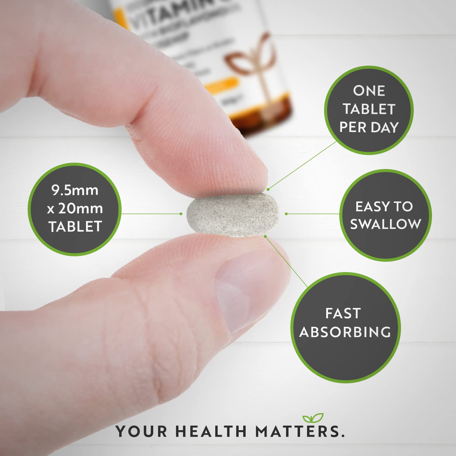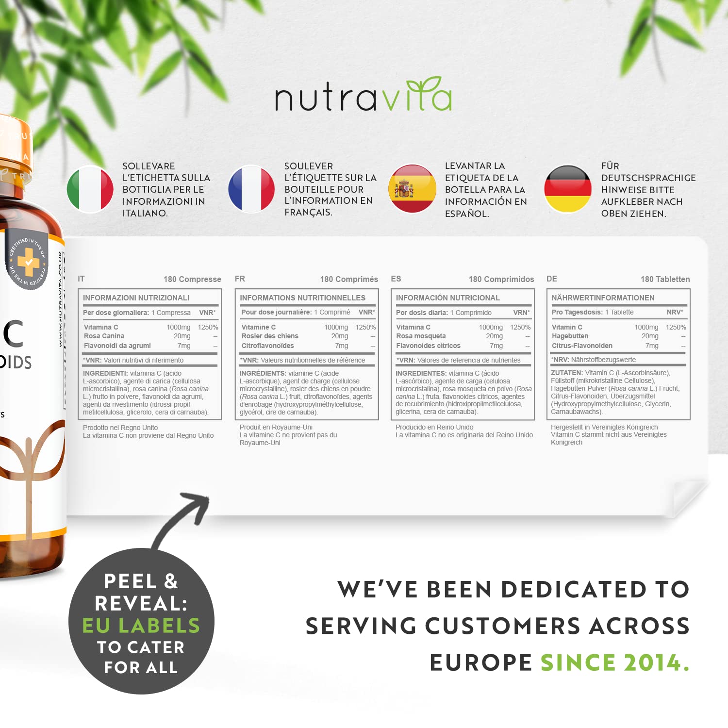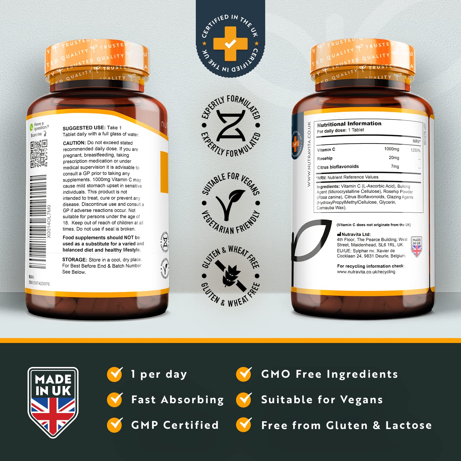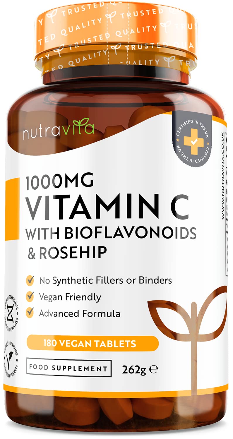 Vitamin C 1000mg – 180 Premium Vegan & Vegetarian Tablets – 6 Month Supply – High Strength Ascorbic Acid – with Added Bioflavonoids & Rosehip – for Normal Immune System – Made in The UK by Nutravita