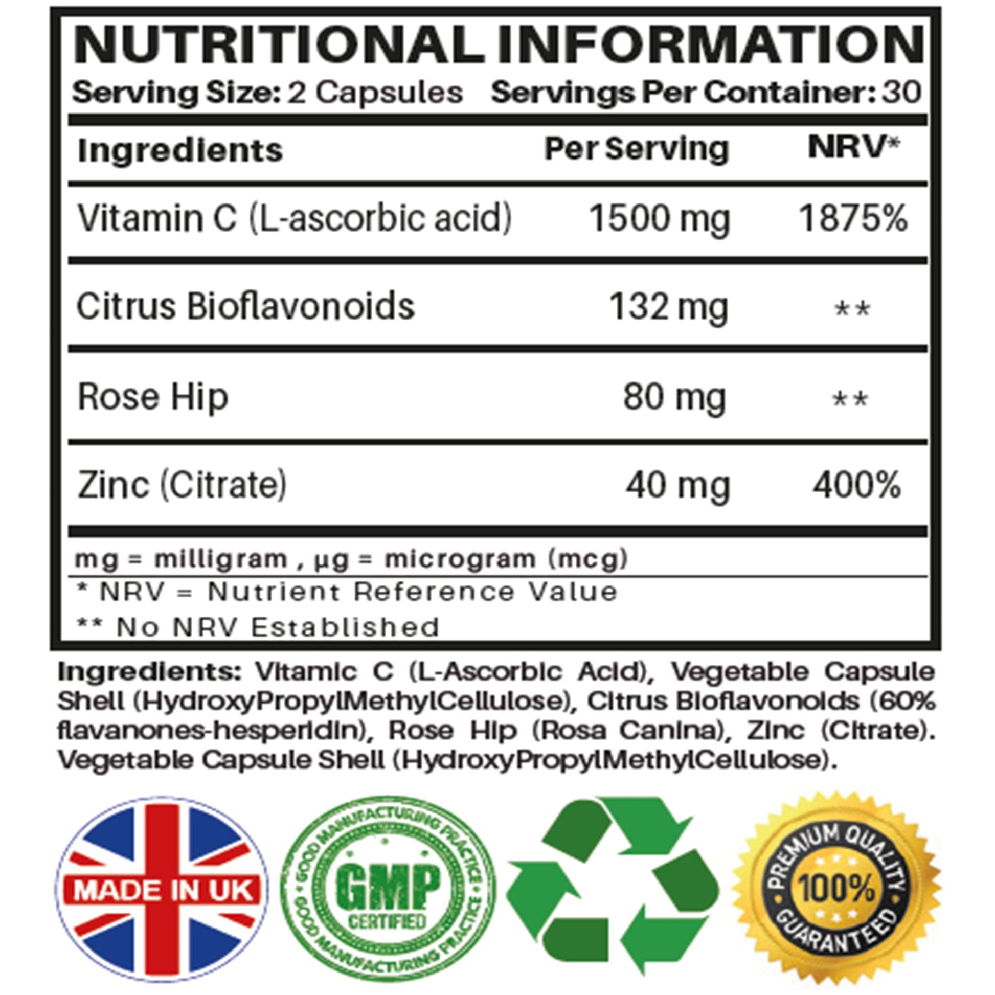 NUTRABYTES Vitamin C, Rosehip, Citrus Bioflavonoids and Zinc Complex, 60 Vegan Capsules, 1 Month Supply (Dosage: 2 Capsules), Made in UK for Nutrabytes. Number of Capsules: 60 vegan / vegetarian capsules. Supply: 1 Month Supply (2 capsule dosage)More Info