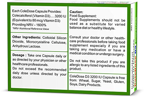 Vitamin D 3200 IU –Equivalent to 80 mcg - ColeDose D3, Premium Vitamin - 30 Capsules- One a Day