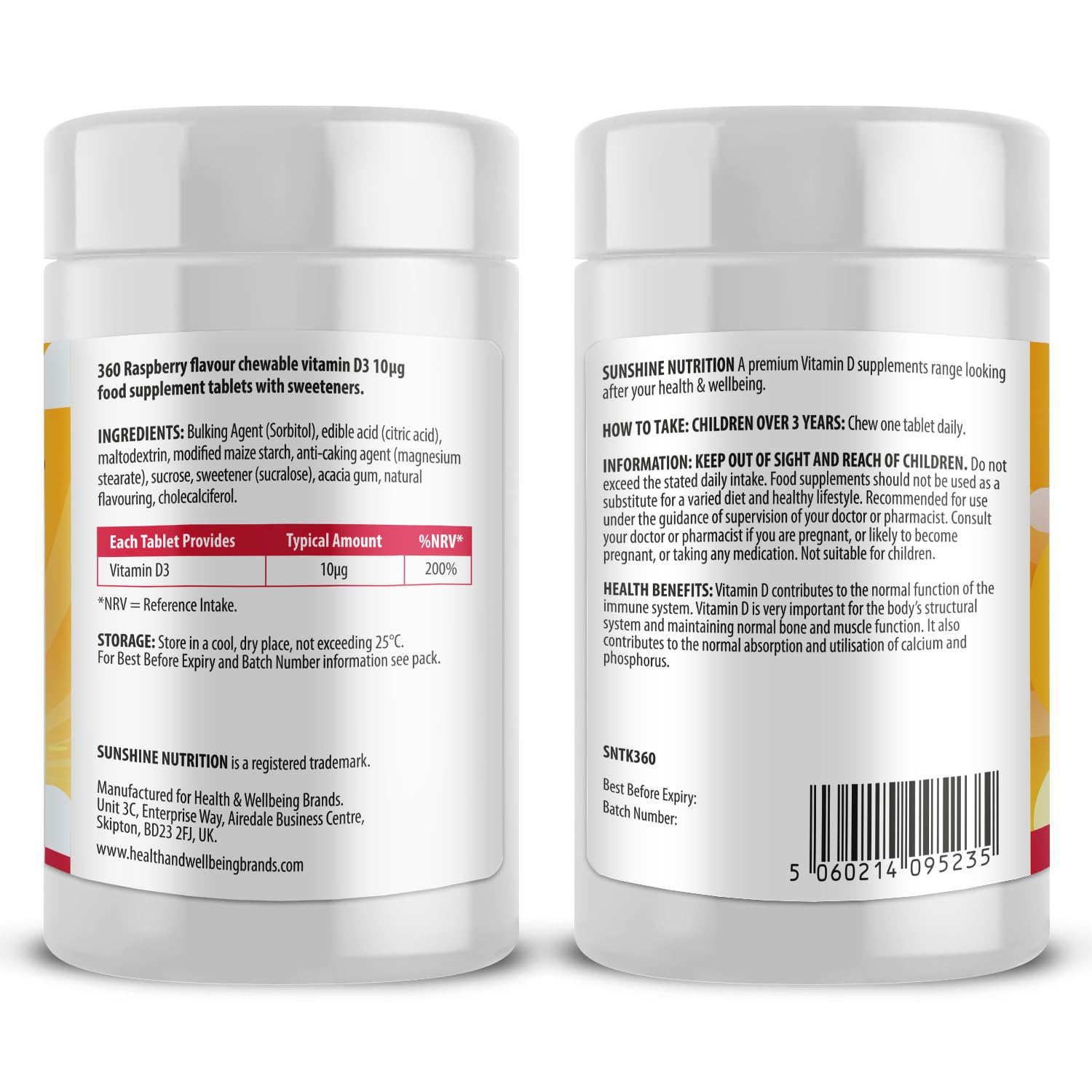 Vitamin D Chewable Supplements for Children 360 Raspberry Flavour Tablets by Sunshine Nutrition (Kids Chewable D3)