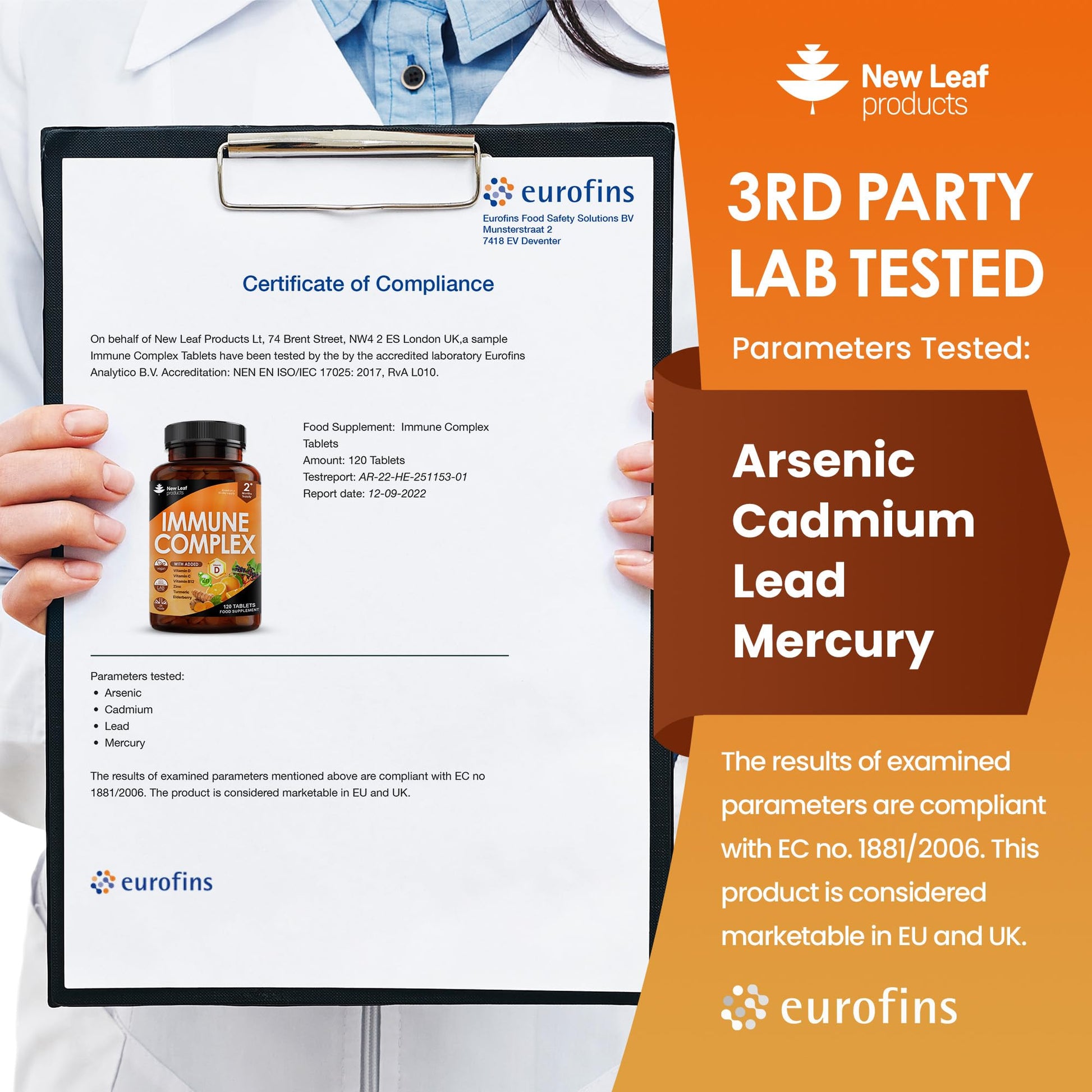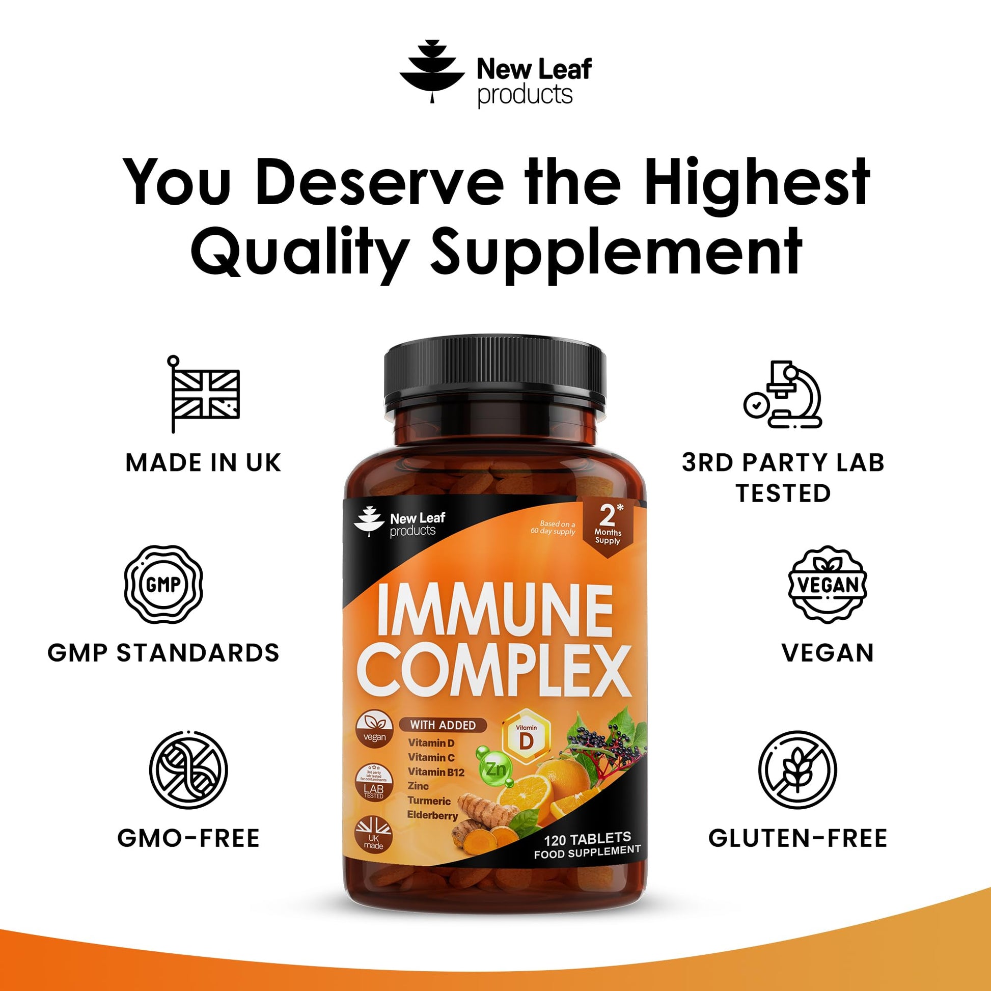 BOOST YOUR IMMUNITY WITH NEW LEAF'S IMMUNE COMPLEX - Your immune system is your body's first line of defense against illnesses, and New Leaf's Immune Complex is designed to help fortify it. Our carefully crafted formula is packed with essential nutrients to support a robust immune response. With 120 tablets in each bottle, a two-month supply ensures that you have ample time to experience the remarkable benefits of this comprehensive immune support supplement. A POWERFUL BLEND FOR IMMUNITY - Our Immune Complex combines a potent blend of key nutrients known to bolster the immune system. It contains Vitamins D3, B12 & C, which are vital for immune function and overall health. Zinc, another essential mineral, plays a critical role in the normal function of the immune system. Turmeric, together with Elderberry, are known antioxidants adding an extra layer of defense. Together, these ingredients empower your body to ward off threats and stay healthy. THE BENEFITS OF IMMUNE COMPLEX - Our Immune Complex offers a multitude of benefits for your immune system and well-being. Vitamin D3 supports the normal function of the immune system and is crucial for maintaining strong bones. Vitamin B12 contributes to the formation of red blood cells and supports the immune system. Vitamin C aids in immune cell function. Zinc is essential for immune cell development and function. With our Immune Complex, you're investing in your immune system's strength.More Info