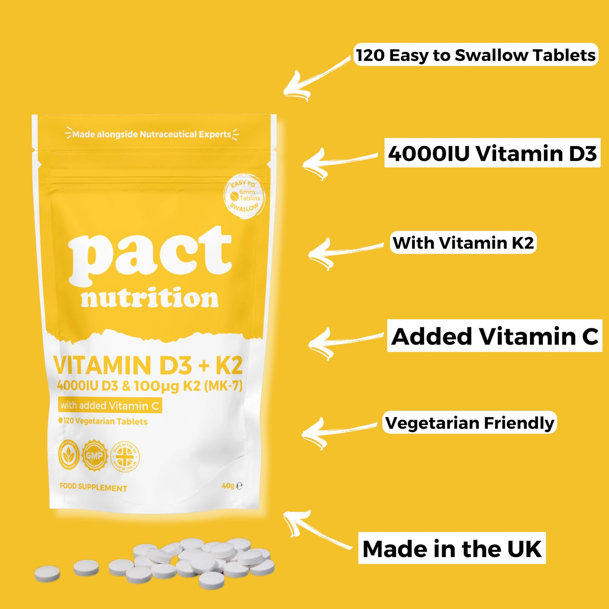Vitamin D3 4000IU & Vitamin K2 MK7 100μg with Vitamin C - Vitamin D3 K2 High Strength VIT D Supplement - 120 Vegetarian Tablets - Easy to Swallow, High Strength One Per Day Formula - Pact Nutrition