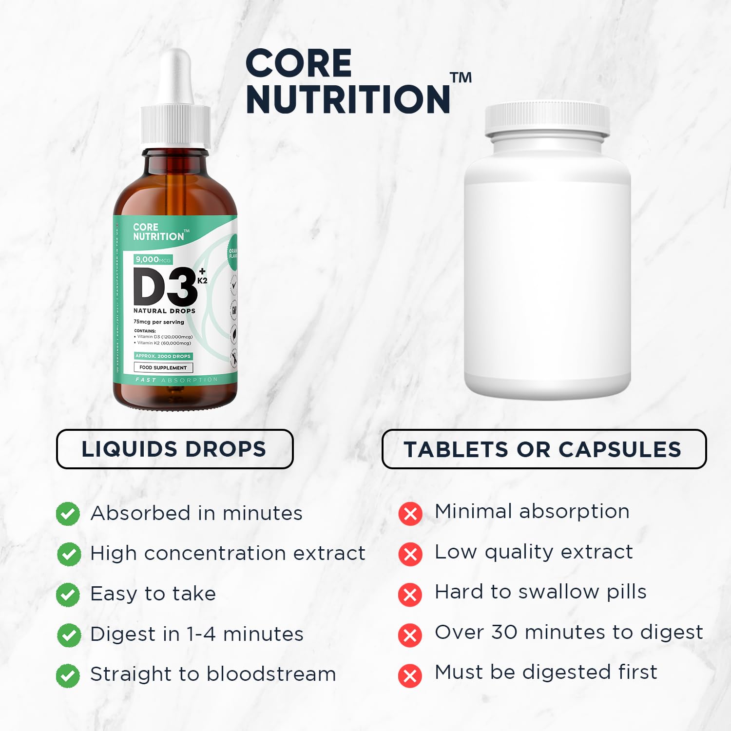Vitamin D3 + K2 Liquid Drops by Core Nutrition - Vegan - High Strength 2000iu D3 + 25mcg K2-2 Month Supply - 120 Servings - 9,000mcg 60ml Bottle - Made in UK