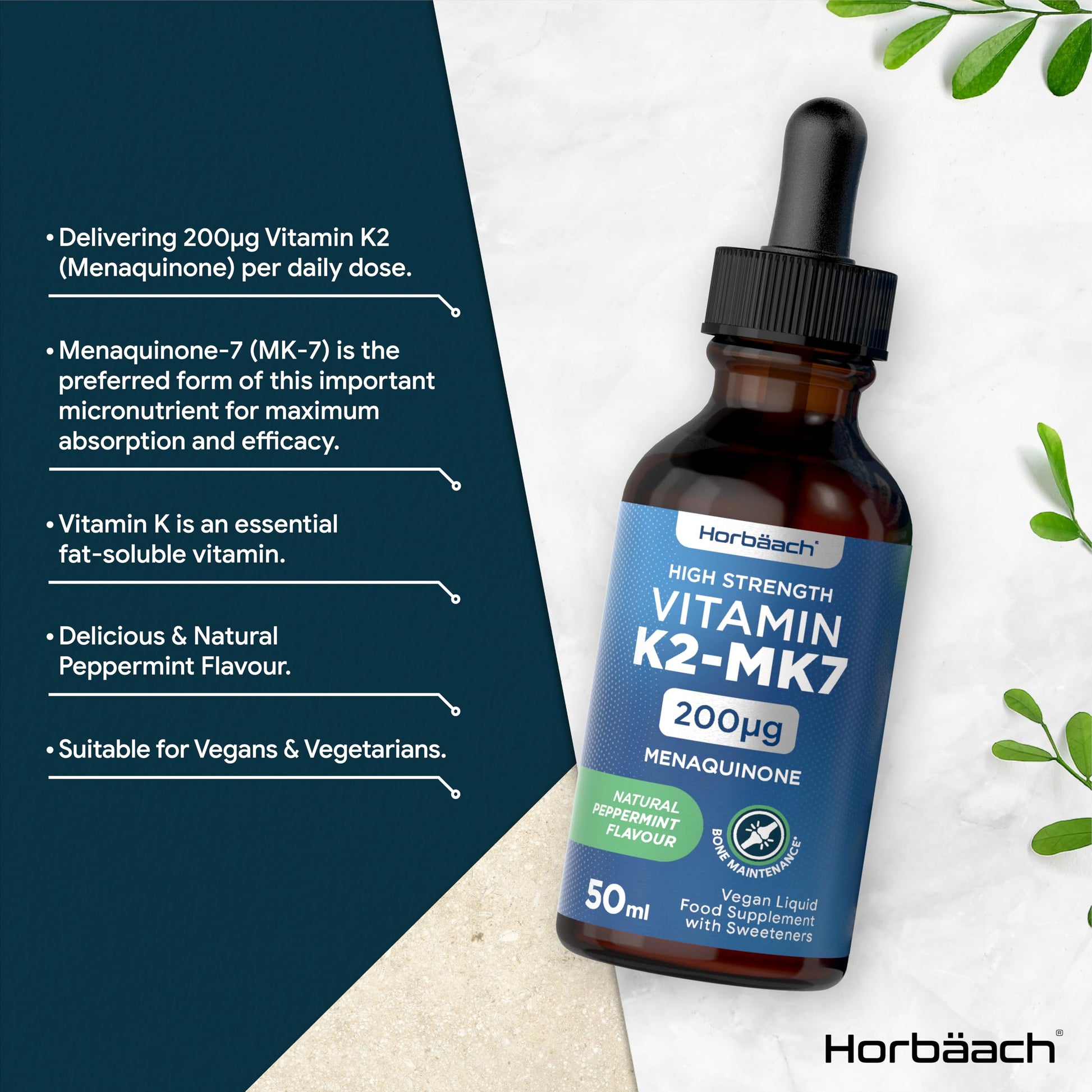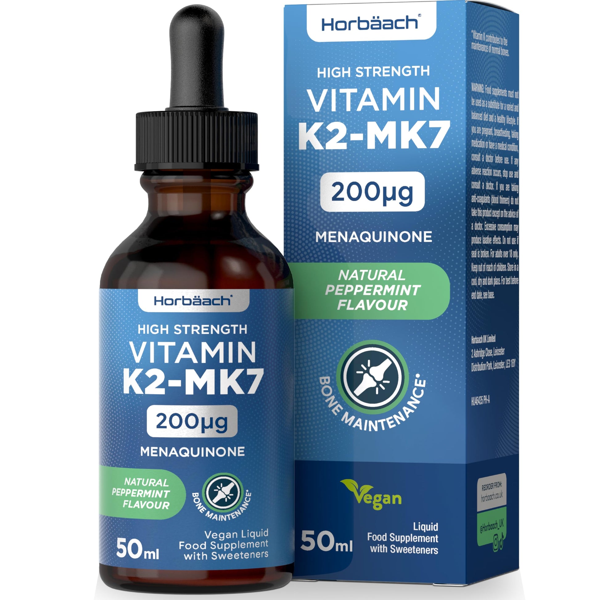 Vitamin K2 MK7 Drops 200ug | 50 ml | High Strength Vitamin K2 as Menaquinone MK7 | Peppermint Flavour | Vegan Liquid Food Supplement | by Horbaach