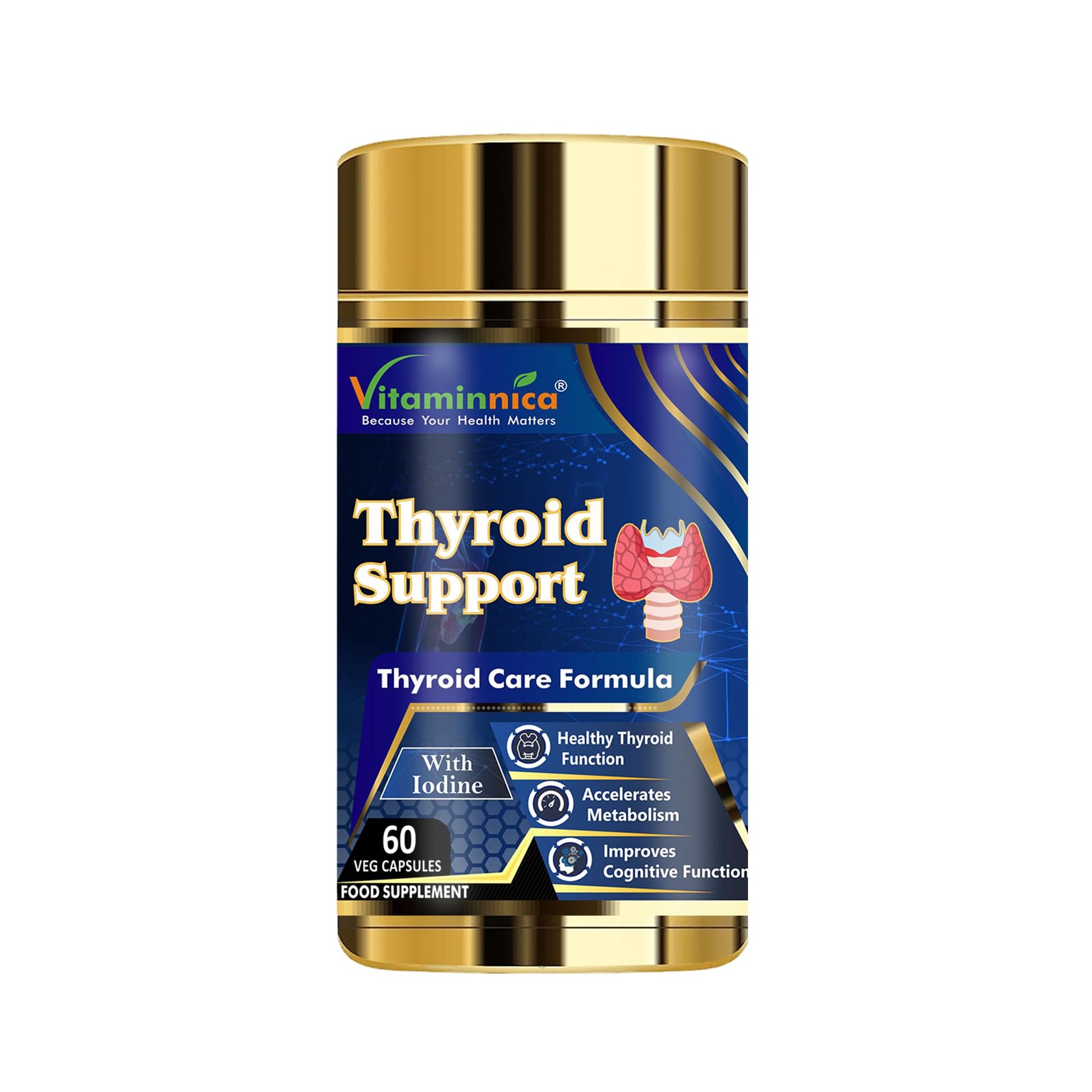 Thyroid Support Capsules are dietary supplements which helps to support in the proper functioning of thyroid gland. Thyroid gland plays a crucial role in the metabolism, growth, and development of the human body. It is a blend of vitamins, minerals to support optimal thyroid gland function. Vitaminnica Thyroid Support capsules are meticulously crafted to promote optimal thyroid health and support overall metabolic function. Our unique blend of vitamins, minerals, and herbal extracts works synergistically to maintain healthy thyroid hormone levels, enhance energy production, and support immune function.More Info