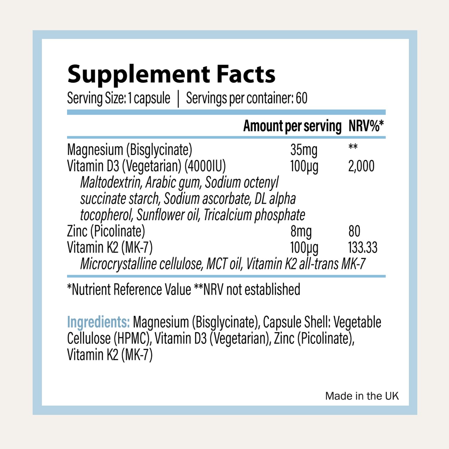 Support your bones, muscles, and immune system with this high-strength Vitamin D3 formula. Combined with Vitamin K2, Zinc, and Magnesium, it helps maintain normal bone and muscle function, supports immunity, and promotes normal blood clotting. Made in the UK to GMP standards.More Info