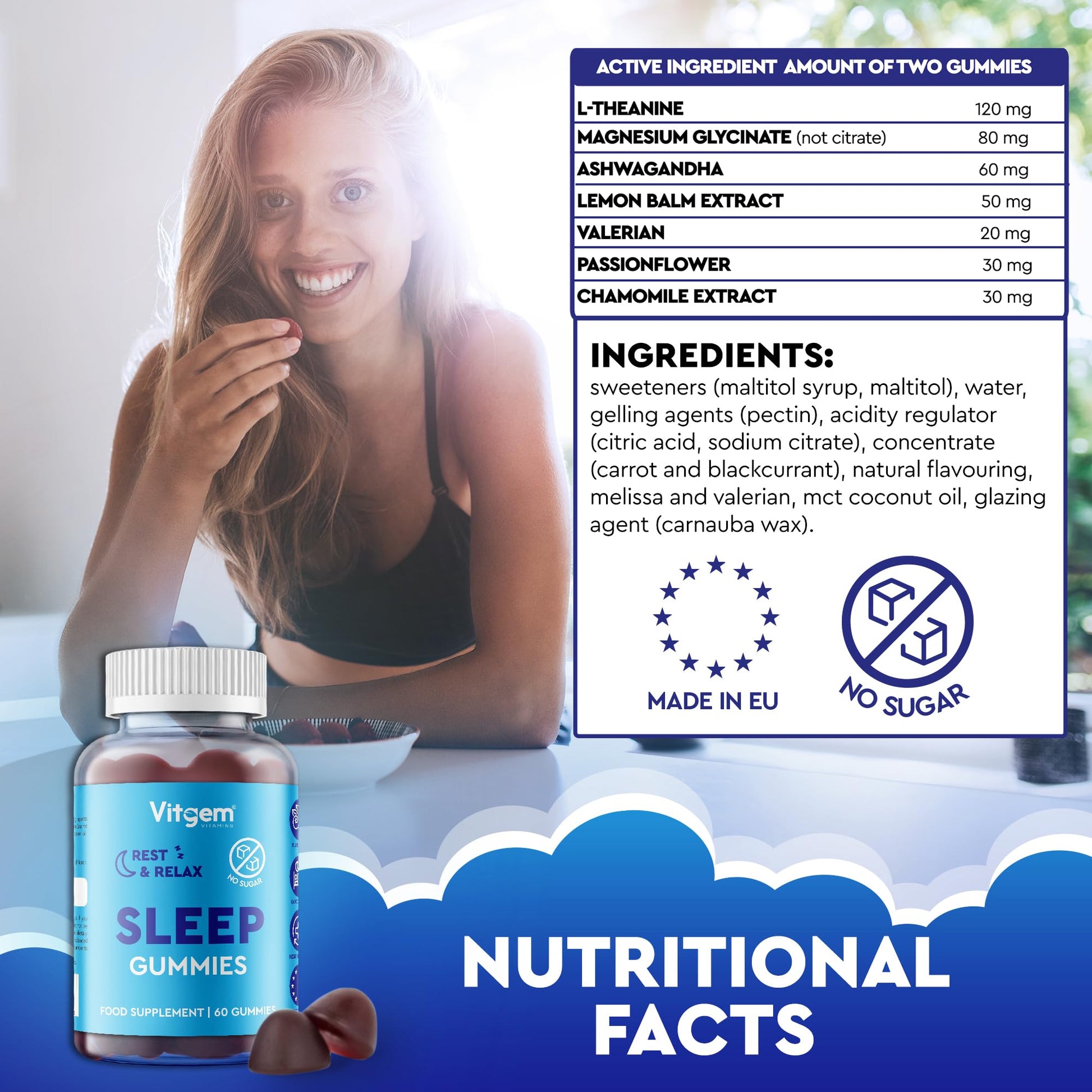 Vitgem Sleep Gummies - 60 Extra Strong Natural Sleep Aid for Adults with Ashwagandha and Magnesium – Sugar Free Blueberry Flavored Vegan Gummies for Relaxation, Restful Sleep and Sound Asleep
