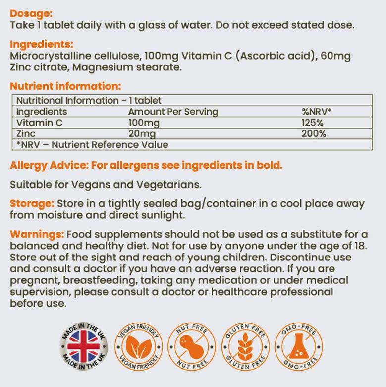 Dosage: Take 1 tablet daily with a glass of water. Do not exceed stated dose. Ingredients: Microcrystalline cellulose, 100mg Vitamin C (Ascorbic acid), 60mg Zinc citrate, Magnesium stearate.Nutritional Information – 1 tablet Ingredients Amount Per Serving %NRV* Vitamin C 100mg 125% Zinc 20mg 200% *NRV – Nutrient Reference Value