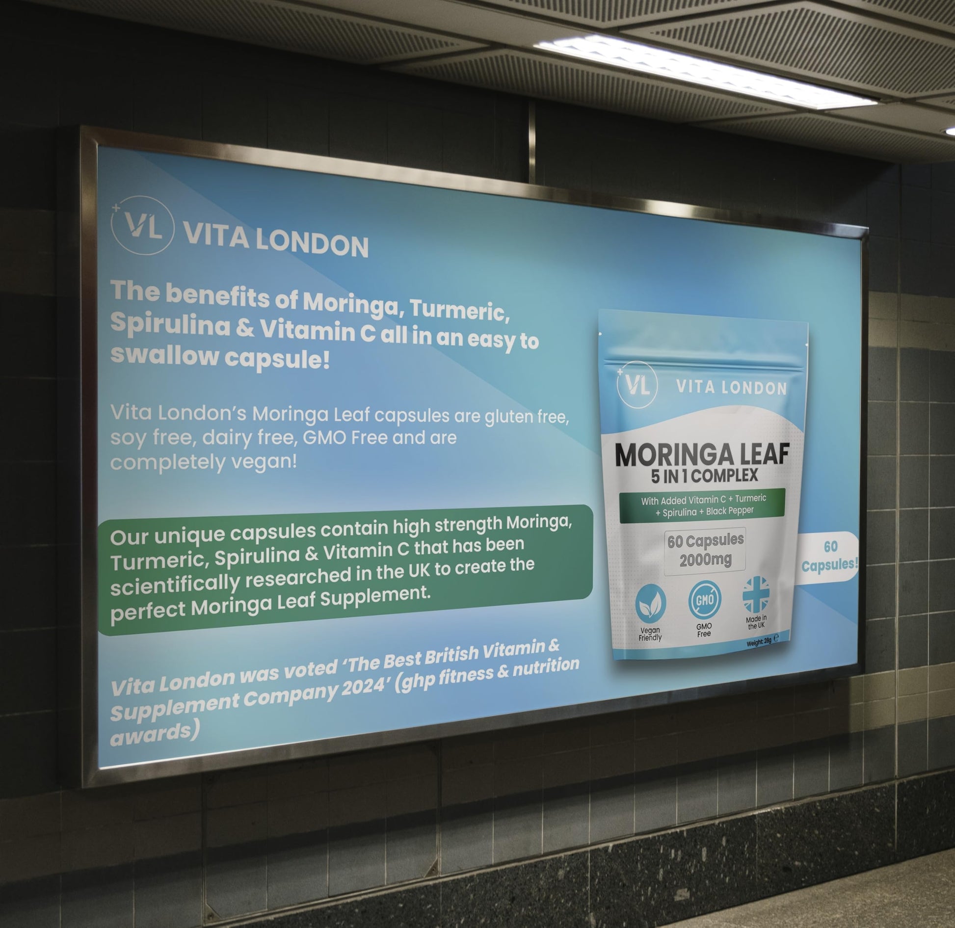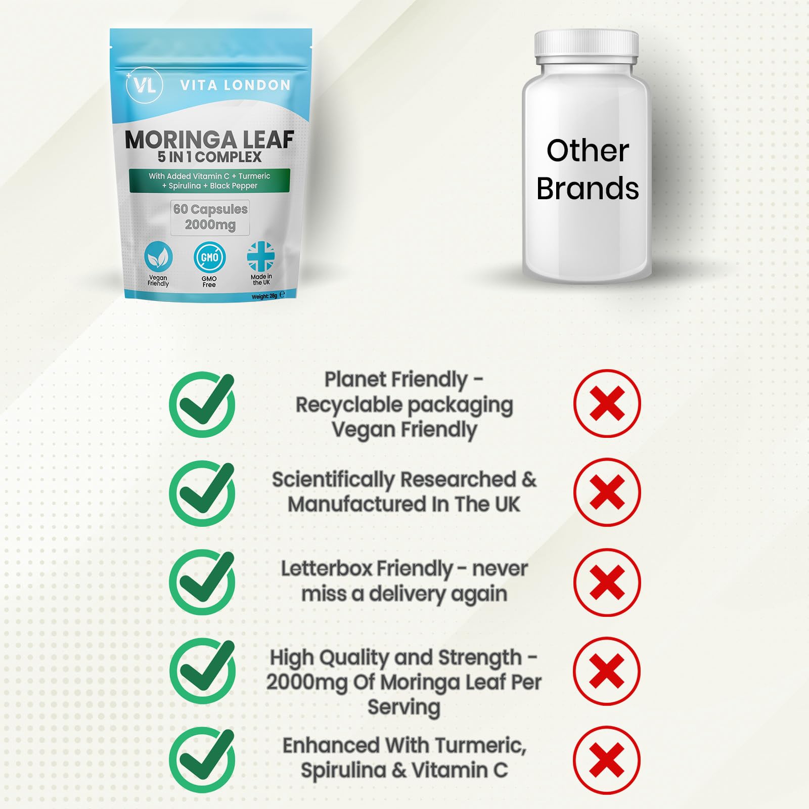 VL Vita London Moringa Leaf Capsules 2000mg | Added Vitamin C + Turmeric + Spirulina + Black Pepper | High Strength Supplements for Men & Women | 180 Vegan Capsules (Not Powder, Tablets of Gummies)