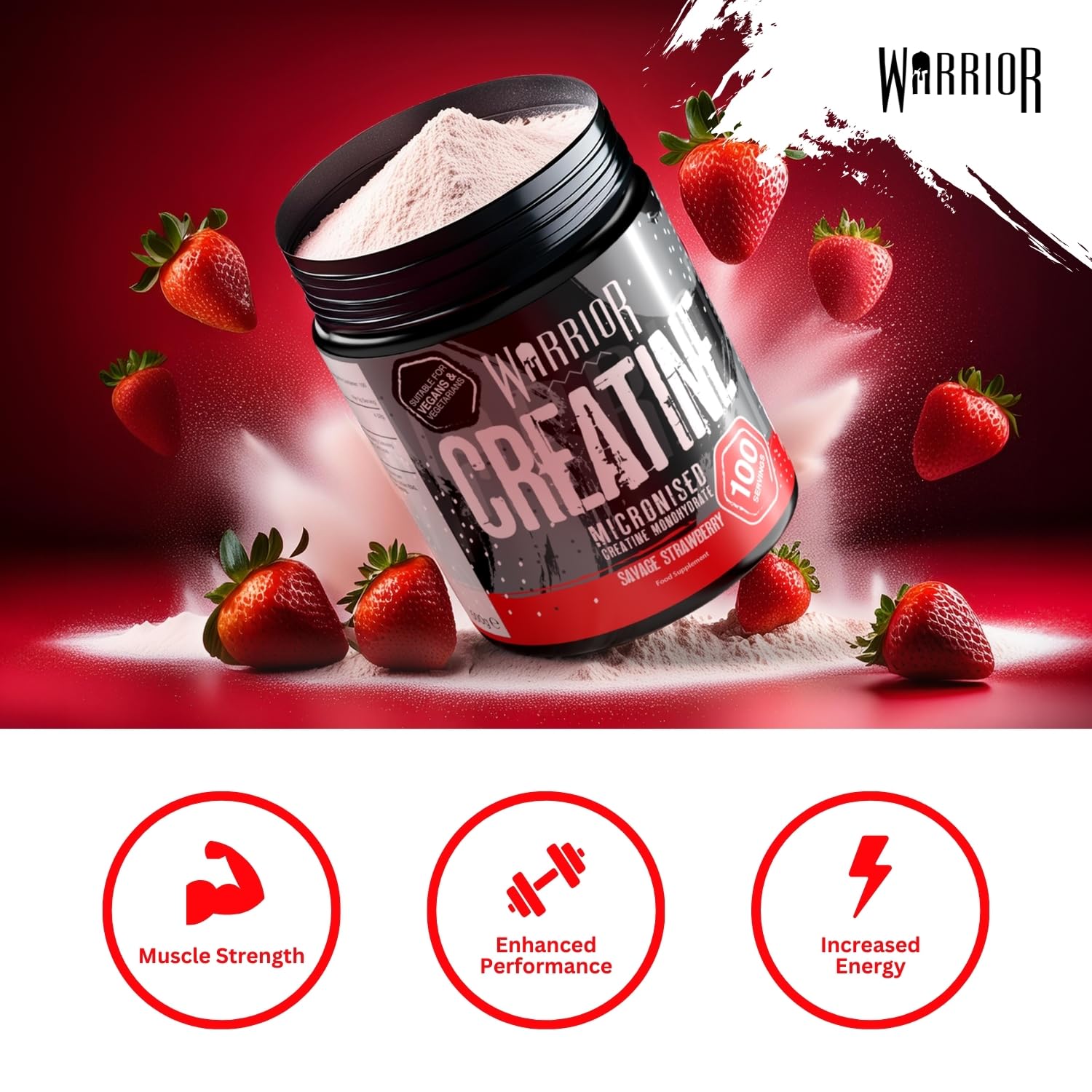 Warrior Creatine Monohydrate Powder 500g – Micronised for Easy Mixing and Consumption – Proven to Improve Physical Performance/Recovery, 5g Servings (Savage Strawberry)