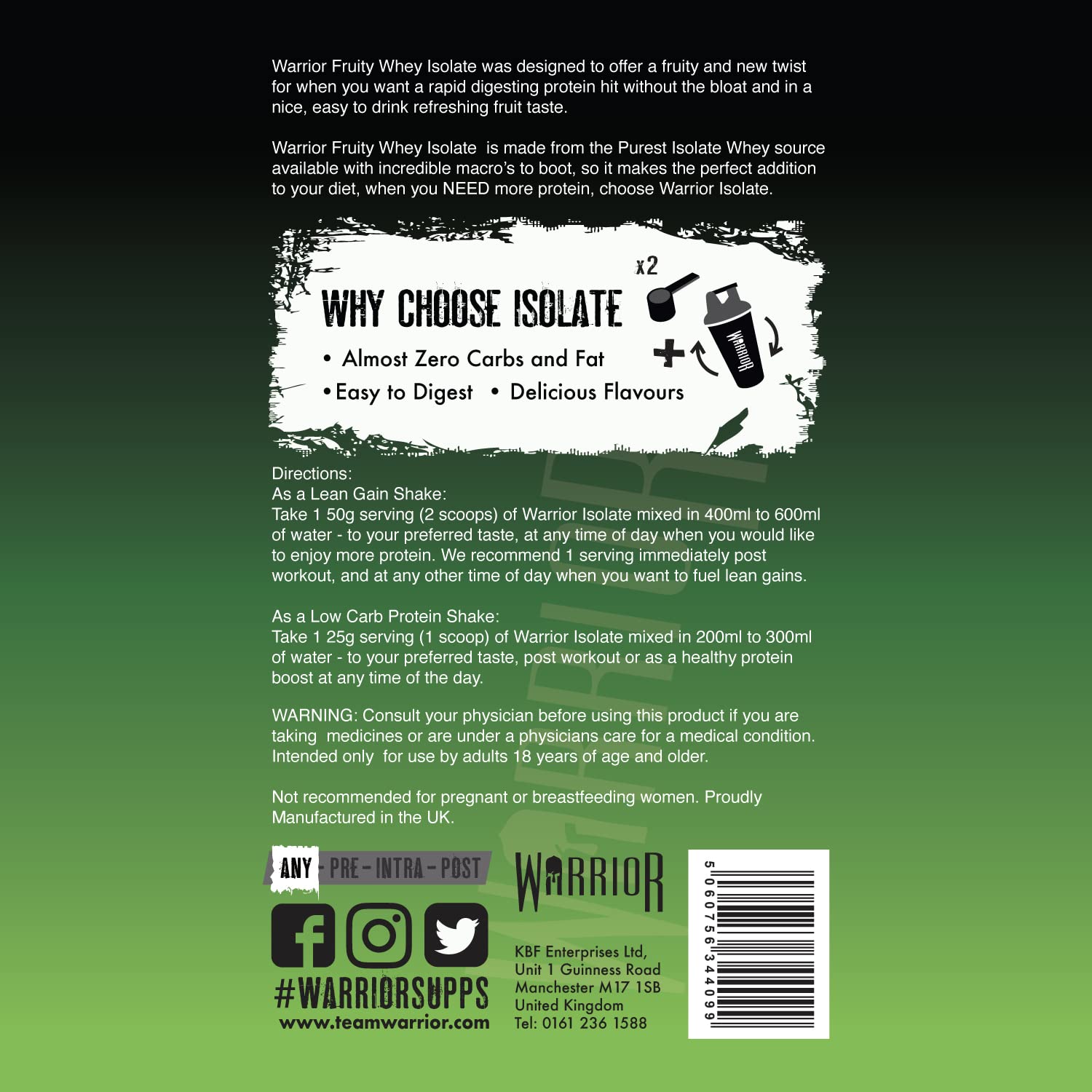 - ✅ WARRIOR FRUITY WHEY ISOLATE – Is designed to offer a fruity new twist when you want a rapid digesting protein to hit without the bloat and in a nice, easy to drink refreshing fruit taste.