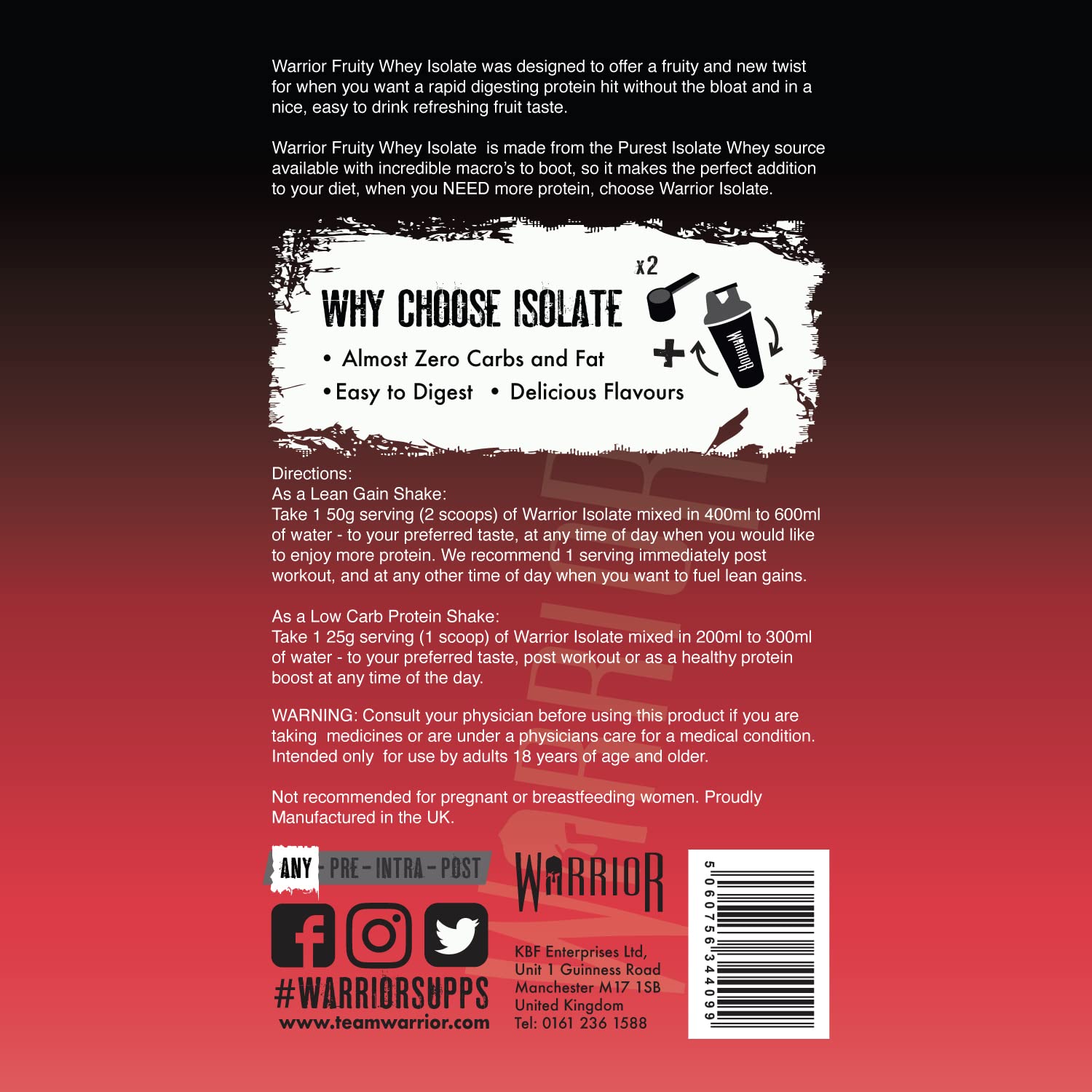 - ✅ PUREST ISOLATE – Warrior Fruity Whey Isolate is made from the Purest Isolate Whey source available with incredible macros to boot, so it makes the perfect addition to your diet, when you NEED more protein, choose Warrior Isolate.