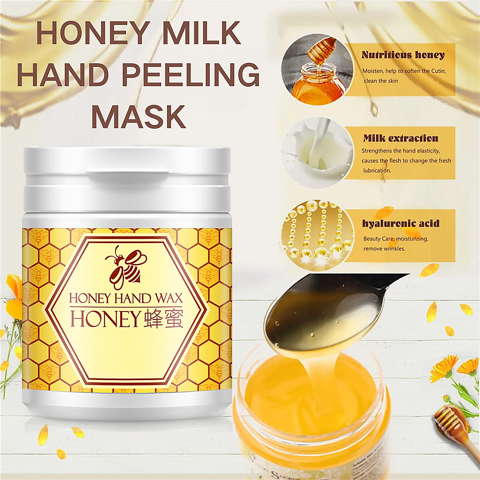 Natural Honey Milk Hand Mask:Gently apply on hands to form a moisturizing film, moisturizeand purify tender skin, help to improve dry and rough hands,and make hands smooth and delicate like silk!