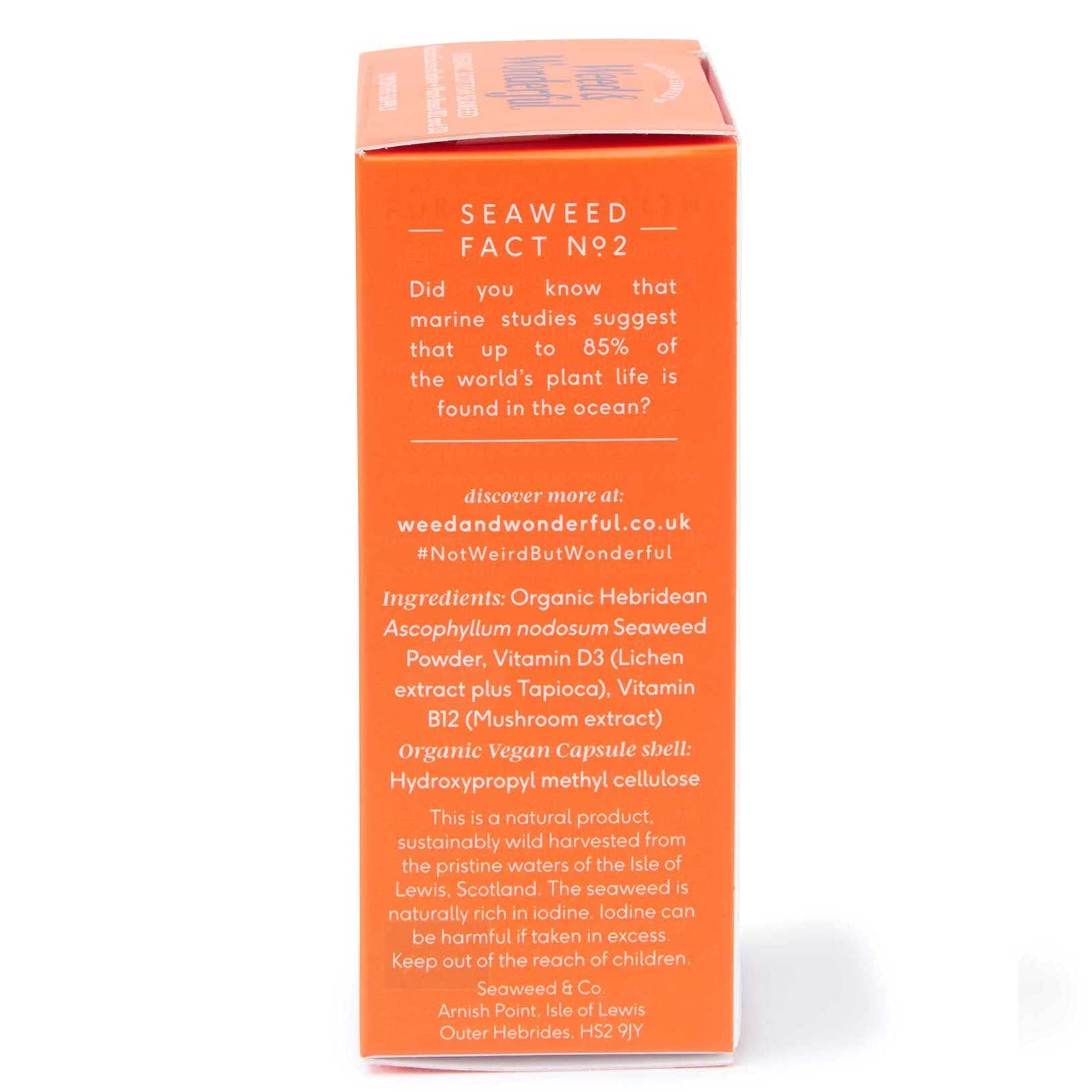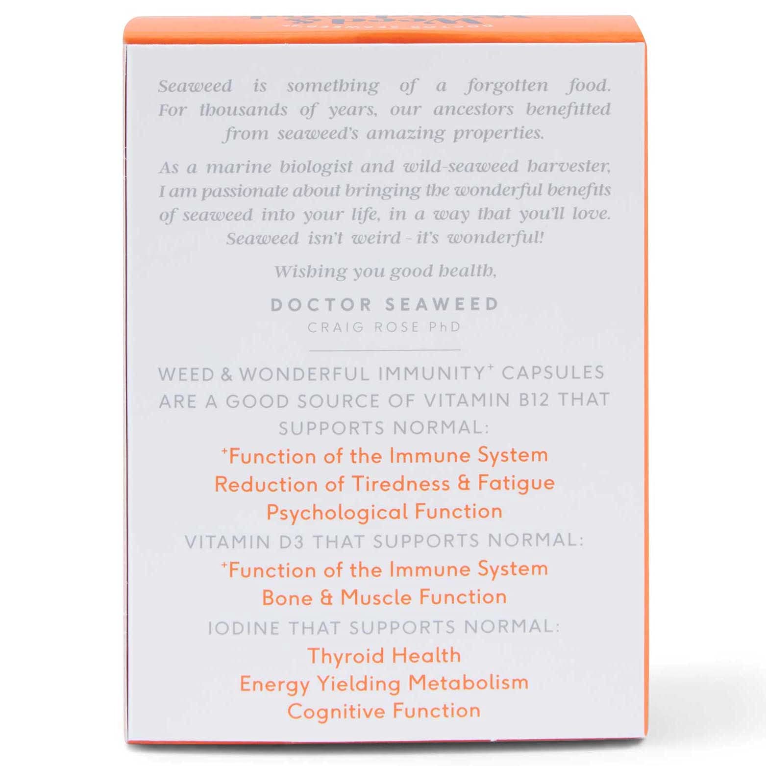 Doctor Seaweed’s Immunity+ seaweed capsules are an extremely convenient way to incorporate seaweed into your everyday life, and gain from its many health benefits. With broader nutrition than land plants, seaweed contains a huge range of minerals, trace elements, vitamins, amino acids and essential fatty acids, and can be a great addition to a varied diet and healthy lifestyle. In fact, seaweed is the only good natural plant-based source of iodine. Supports immunity & wider wellness Reduction of tiredness and fatigue Boosts energy levels 100% natural nutrition with plant-based sources of Iodine, vitamins D3 and B12 EFFECTIVE - Research has shown that our organic Scottish seaweed releases iodine more slowly, with longer retention in the body compared to artificial sources (potassium iodide). The capsules are further enhanced with all natural sources of Vitamins B12 & D3. IMMUNITY SUPPORT - Vitamins B12 & D3 have been scientifically validated with approved health claims to support immunity & wider wellness. Prevent and protect against colds & flu with just one capsule a day. INGREDIENTS - Each vegan capsule contains Vitamin B12, Vitamin D3 & 500mg of pure seaweed powder, sustainably wild-harvested from the pristine waters of the Isle of Lewis, Scotland. Vegan, organic, gluten-free & kosher certified. ABOUT US - As a marine biologist, Doctor Seaweed, is passionate about helping you discover the wonder of seaweed. Benefit from the natural health & wellness of our multi award-winning supplement range.More Info