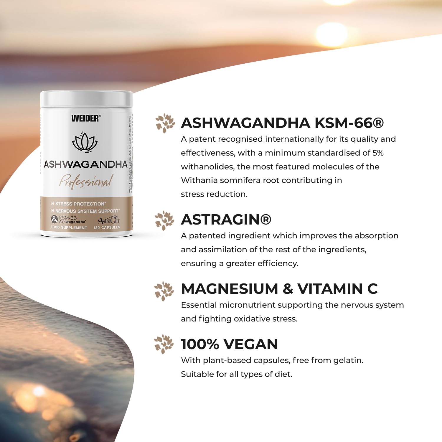 Weider Ashwagandha Professional (120 capsules). Ashwaghandha KSM-66 enriched with AstraGin to improve absorption, Magnesium, Vitamine C. For the normal functioning of the Nervous System. (60 servings)