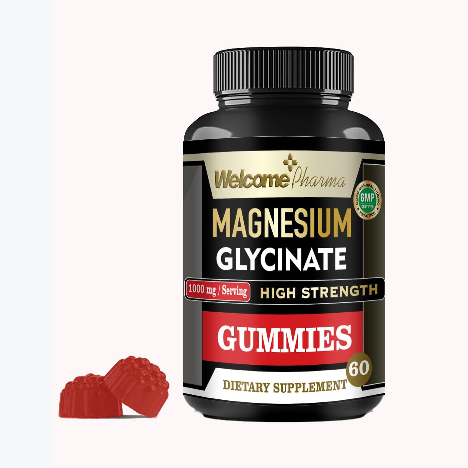 Welcome Pharma Pure Magnesium Glycinate Gummies — High Strength 1000mg/Serving for Muscle Relaxation, Sleep Support & Stress Relief — Vegan, Non-GMO, Gluten-Free, Lab Tested (60 Gummies)