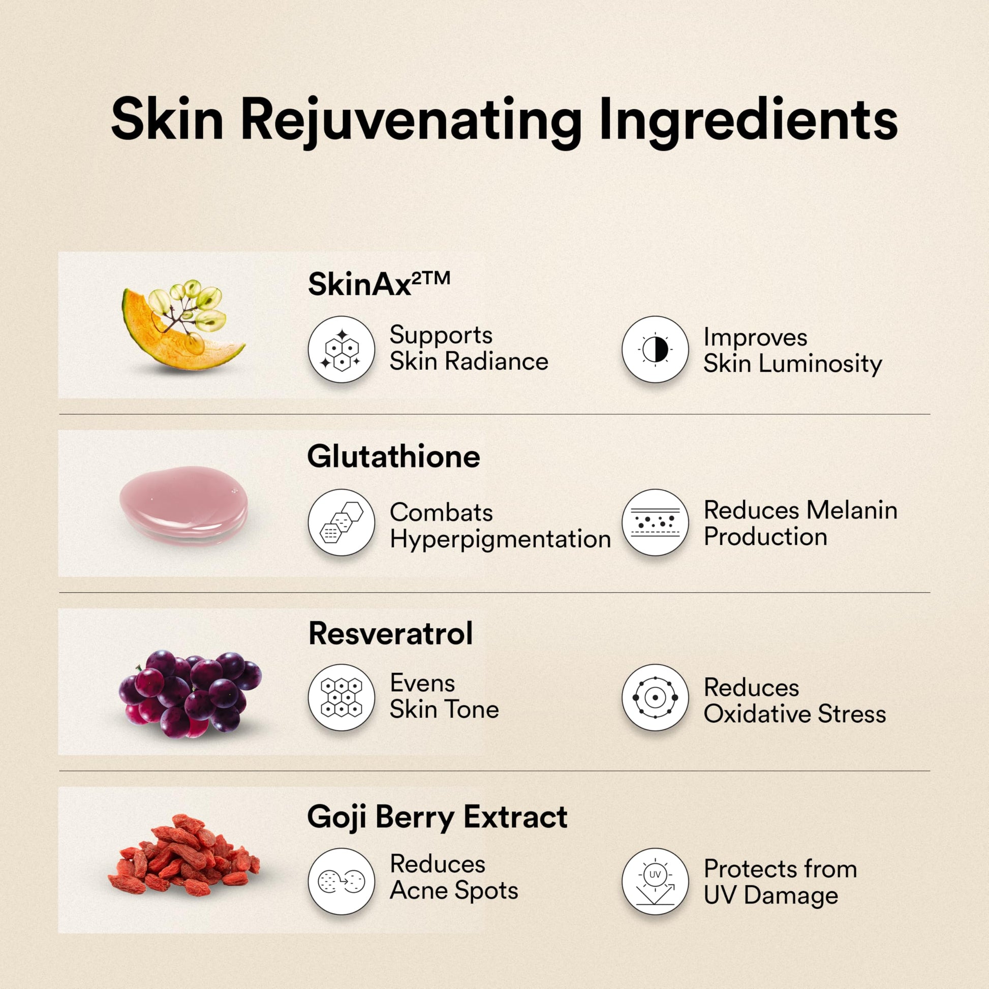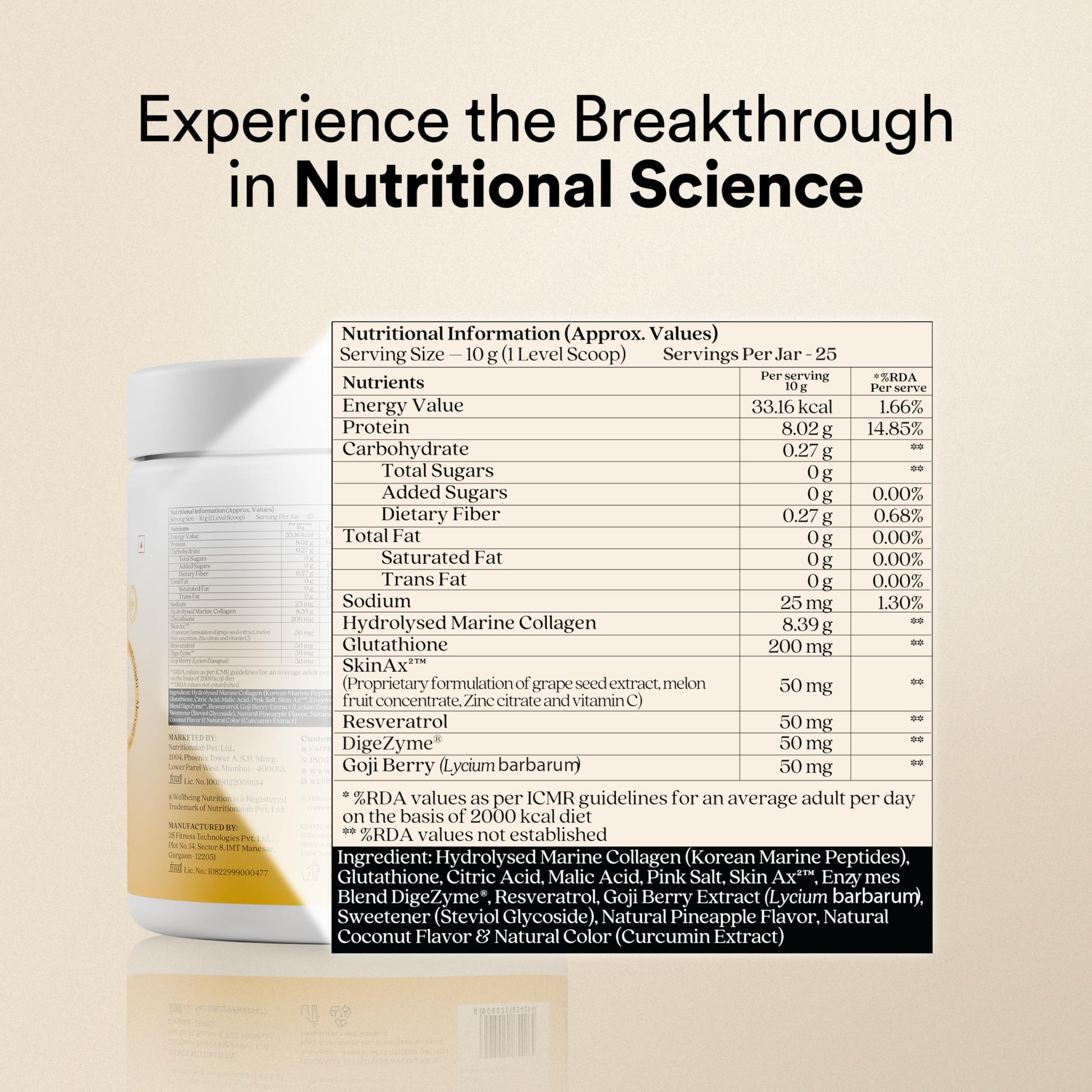 A dermatologist recommended, proprietary formulation of 8000 mg Premium Wild Caught Pure Marine collagen (Type I & III) from deep sea fish, combined with clinically studied ingredients like SkinAx², Glutathione, Resveratrol, DigeZyme & Goji berry, in precise doses. A single serving of Glow collagen powder is designed to give you that glow from within by boosting collagen levels, improving skin elasticity and locking in moisture for that luminous youthful radiance. With 100% absorption, it helps skin cells regenerate & renew themselves, reduce wrinkles, fine lines, acne & pigmentation, while also improving overall skin density, texture & complexion.More Info