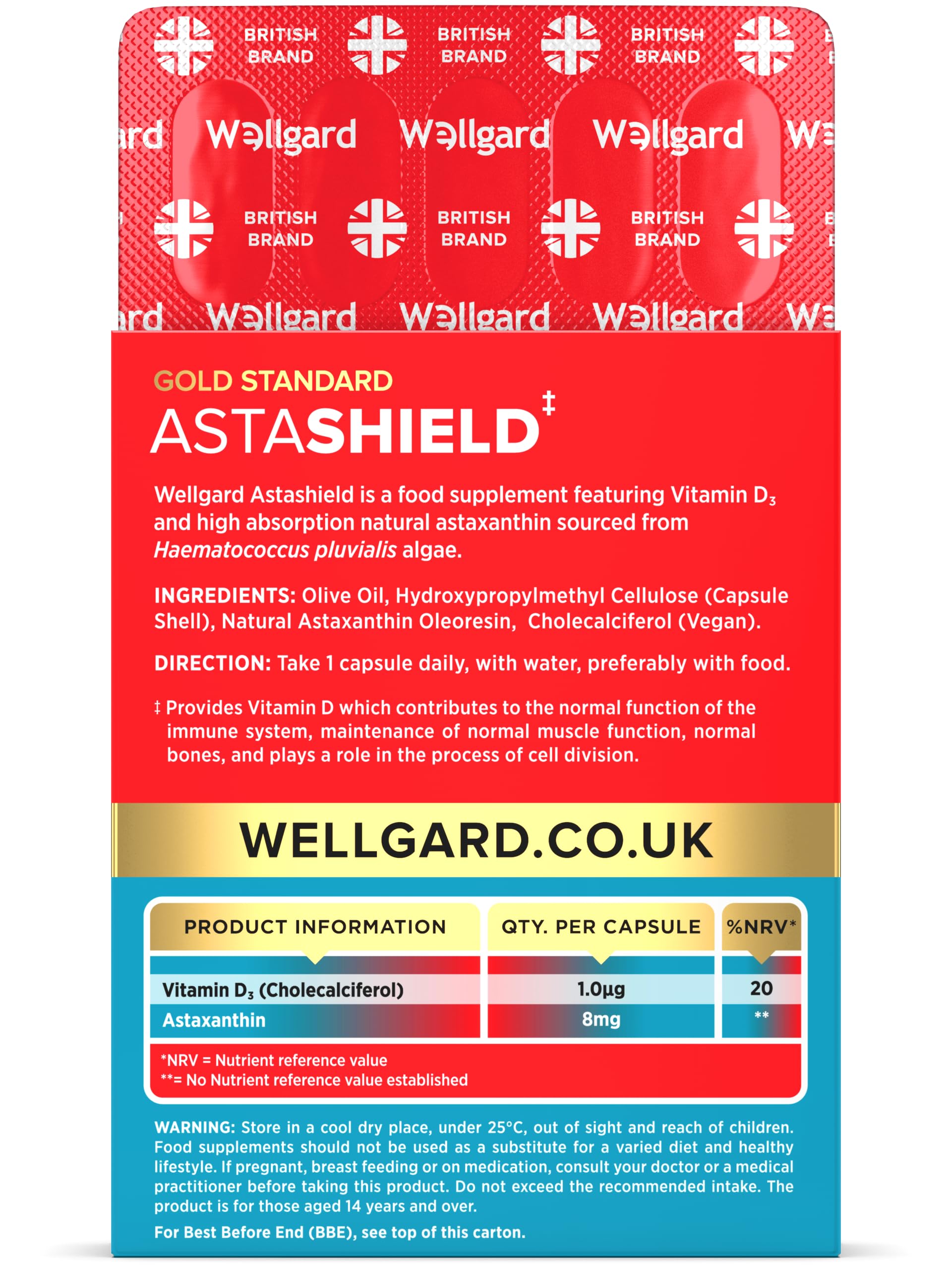 Wellgard Astashield combines natural astaxanthin, sourced from freshwater microalgae, with Vitamin D₃ to support your overall wellness.More Info