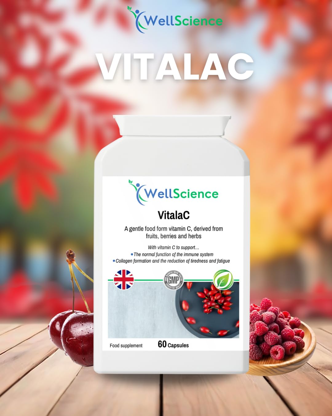VitalaC is a premium food form Vitamin C supplement derived from a potent blend of fruits, berries, and herbs. Enriched with Acerola Cherry, Parsley Leaf, Blackcurrant, Rosehip, and Elderberry Extracts, this formula supports the normal function of the immune system, collagen formation, and reduces fatigue. Each ingredient is carefully selected for its high Vitamin C content and antioxidant properties, ensuring optimal absorption and utilisation. With VitalaC, you can maintain a healthy immune system, support skin health, and enhance overall wellness naturally.More Info