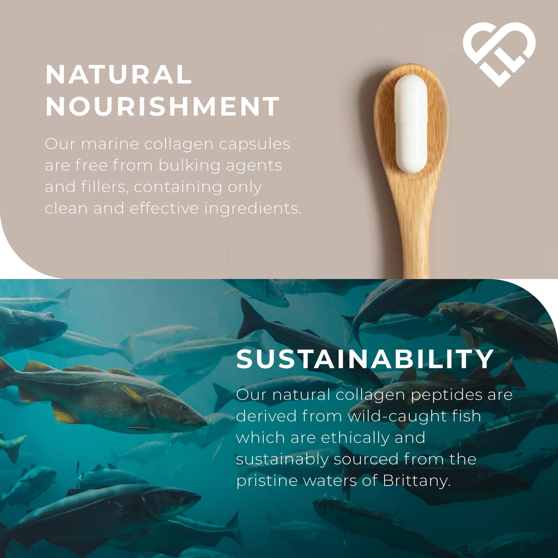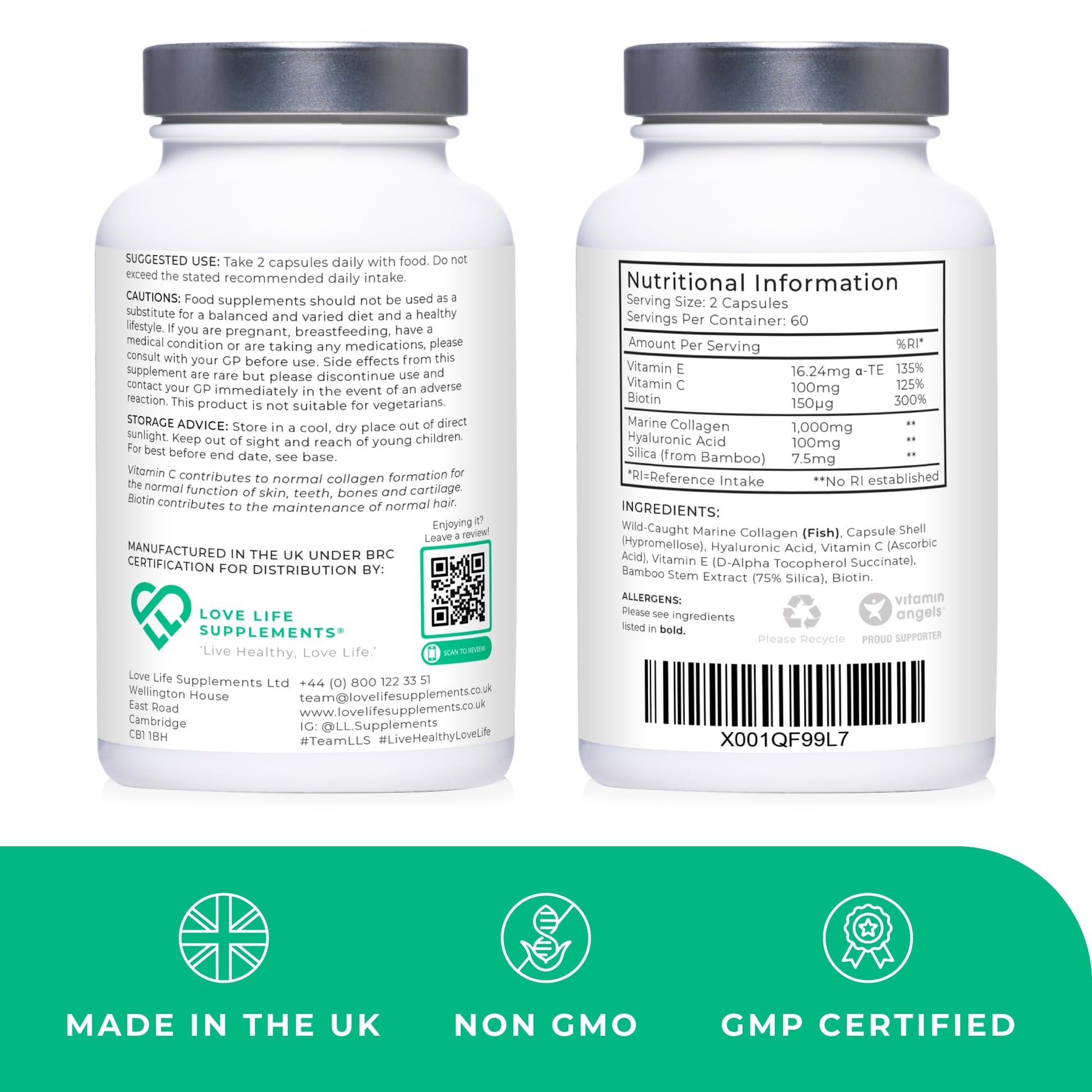 Love Life Supplements – Marine Collagen Complex Discover the secret to radiant beauty with Love Life Supplements' Marine Collagen Complex. This potent formulation is your key to unlocking a youthful glow and promoting healthier living. Sourced from wild-caught fish in Brittany, our Marine Collagen is infused with Vitamin C, and Hyaluronic Acid, this supplement nourishes your skin by promoting elasticity and reducing the appearance of wrinkles. It revitalises your hair and strengthens your nails. With added Biotin and Bamboo Stem extract it also supports your body's vital functions, aiding in digestion, promoting bone strength, and contributing to joint and tendon health. Easy to use, just take two capsules each day to start your journey towards better health and radiant beauty. A daily dose of wellness for those who value their health as much as their appearance. Embrace the goodness of Marine Collagen Complex and enjoy a life filled with vitality, beauty and confidence. Features at a Glance Generous 1000mg of Hydrolysed Marine Collagen per serving Added Vitamin C increases the generation of collagen Biotin and Bamboo stem infused for skin and hair health Supports bones, tendons and ligaments Clinically assessed and approved Sustainably sourced using an ecological extraction process Made in the UK Live Healthy. Love Life. Our mission is simple - to help as many people as we possibly can achieve optimal health by providing premium, effective and clean supplements. We love being able to help people achieve their health and fitness goals so you can be the best version of yourself and love the life you live! Our slogan is at the core of everything we do: Live healthy, love life.More Info
