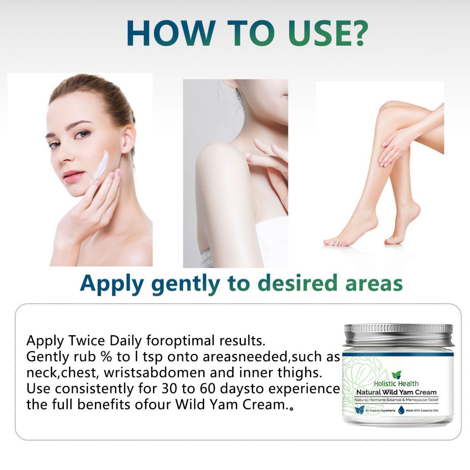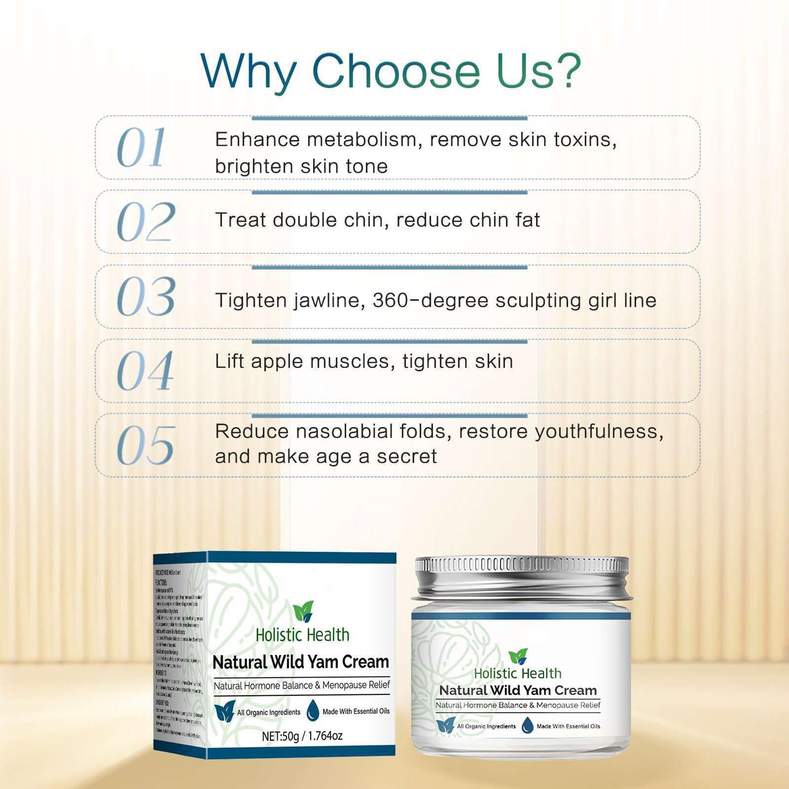 <p><strong>Ingzy Wild Yam Cream, Wild Yam Cream for Hormone Balance, Organic Wild Yam Cream for Menopause, Support Hormone Harmony, Women Wild Yam Root Cream Skin Moisturizer</strong></p><p><br></p><p>Product Ingredients:</p><p>Wild Yam Root Extract, Trifolium Pratense Flower Extract, Holy Basil Leaf Extract, Dogwood Extract, Silybum Marianum Extract, Avocado Oil.</p><p><br></p><p>Net weight:50g/1.78oz</p><p>Product included:1/2/3/4/5 PCS Wild Yam Cream.</p><p><br></p><p>Wild Yam Balancing Cream - Harnessing the natural properties of wild yam, is an all-natural and organic way to help balance hormones.</p><p>Hydrates and Moisturizes : Organic wild yam cream deeply hydrates the skin, enhancing its overall appearance. Well-absorbed, leaving no greasy or sticky residue and doesn't clog pore.</p><p>For All Skin Types :Wild Yam Cream is to be suitable for all skin types, including dry, oily, combination skin.</p><p><br></p><p><em>For best results, Apply 1-2 times daily, on any body part. It can be used on the face, arms, abdomen, thighs, and more, making it a versatile addition to your skincare routine.</em></p>