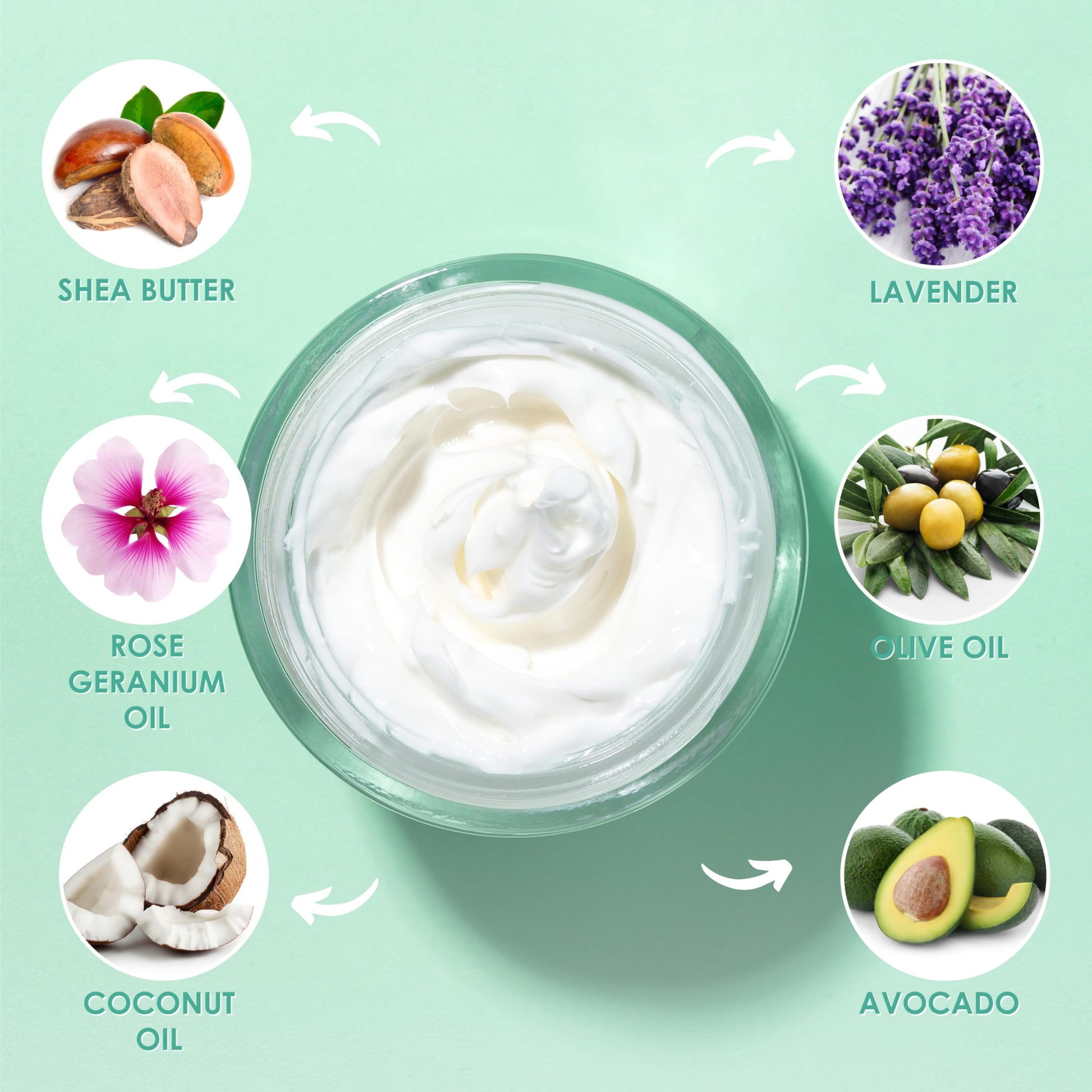 "Indulge your skin with this deliciously smooth, ultra-hydrating body butter! Formulated with nourishing shea butter, coconut oil and calming lavender, this silky body moisturiser transforms dry skin into deeply hydrated and smooth. The irresistible whipped texture absorbs quickly, leaving skin rejuvenated and supple without any oily, greasy residue. Pamper yourself with this nourishing treat."More Info