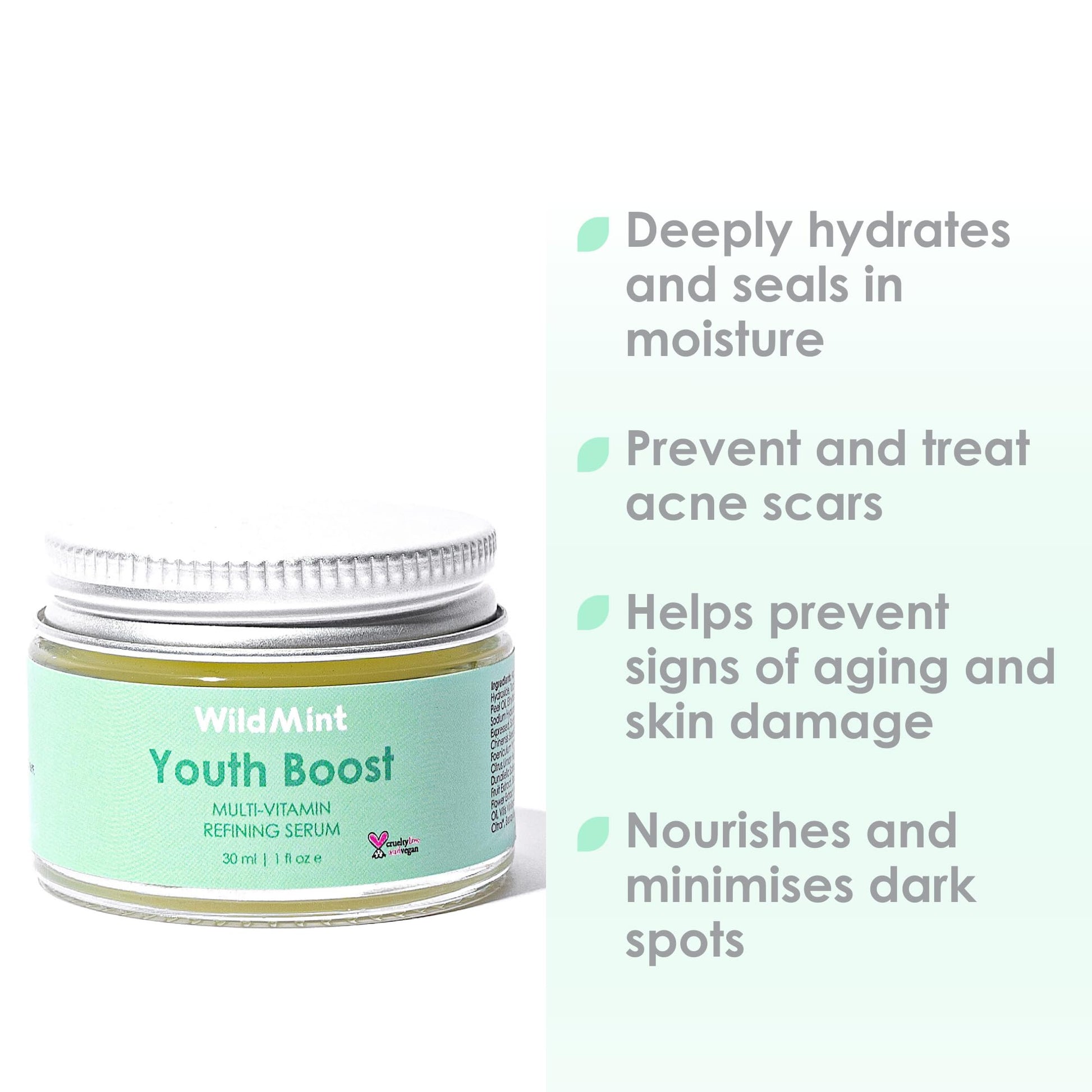 WildMint Youth Boost Natural Face Serum | Hydrating Anti-Aging Serum for Sensitive, Dry, Mature & Menopause Skin | Hyaluronic Acid & Vitamin C | UK Made Vegan & Cruelty-Free Skincare | 30ml