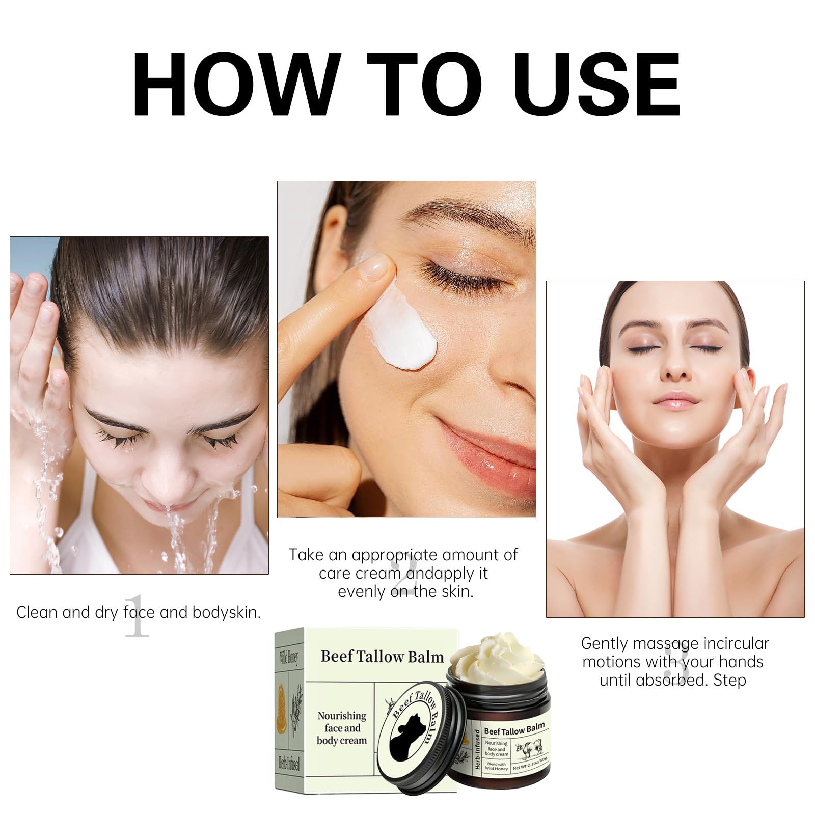 2.apply an appropriate amount of tallow balm evenly on the face or body
