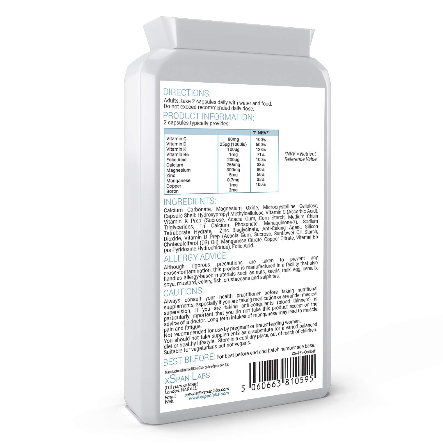 xSpan Labs OsteoBooster 90 Capsules – All-in-One Bone Support Formula – contains calcium, vitamins D3 & K2, Magnesium plus a host of other essential calcium utilisation vitamins and minerals:- Included with the Calcium are Vitamin D3, Vitamin K, Magnesium, Zinc, Copper, Boron & Manganese as well as Folic Acid and Vitamin B6
