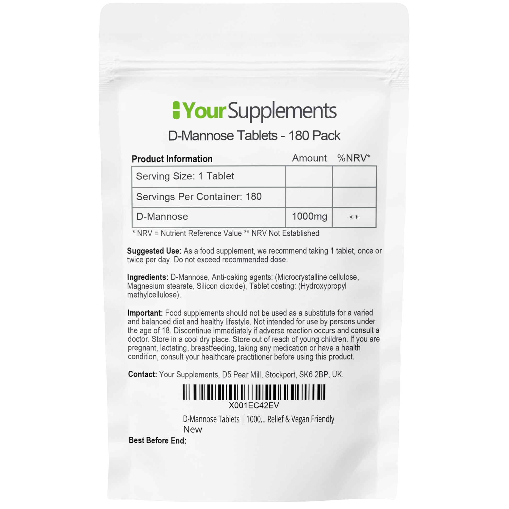 YourSupplements D-Mannose Tablets 1000mg | Easy Swallow Coated Tablets | 180 Pack | High Strength | Natural Relief & Vegan Friendly