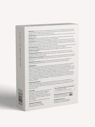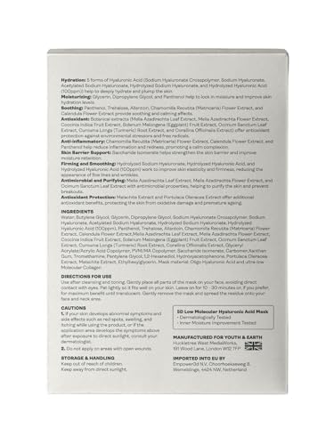 Indulge your skin with the luxurious 5D Low Molecular Hyaluronic Acid Bio-Collagen Face Mask by Youth & Earth. This vegan, dermatologically tested mask provides unparalleled hydration, soothing care, and anti-aging benefits. Available as a single mask or in a pack of 5, it offers a spa-like experience at home. Experience the power of 5 forms of Hyaluronic Acid, including Sodium Hyaluronate Crosspolymer and Hydrolyzed Hyaluronic Acid, for intense hydration and a plump, rejuvenated complexion. Soothing ingredients like Panthenol, Trehalose, and botanical extracts calm irritated skin, promoting balance and serenity. Antioxidant-rich botanicals protect against environmental stressors, reducing signs of aging. Treat yourself to the ultimate skincare luxury with our 5D Low Molecular Hyaluronic Acid Bio-Collagen Face Mask. Cleanse your face thoroughly before applying the mask. Leave the mask on for 10-30 minutes, then gently remove it and massage any remaining essence into the skin. Use regularly to maintain hydrated, youthful, and radiant skin. For optimal results, leave the mask on for 4 hours or until it becomes translucent. For even more benefits, you can wear it overnight and wake up to noticeably brighter skin.More Info