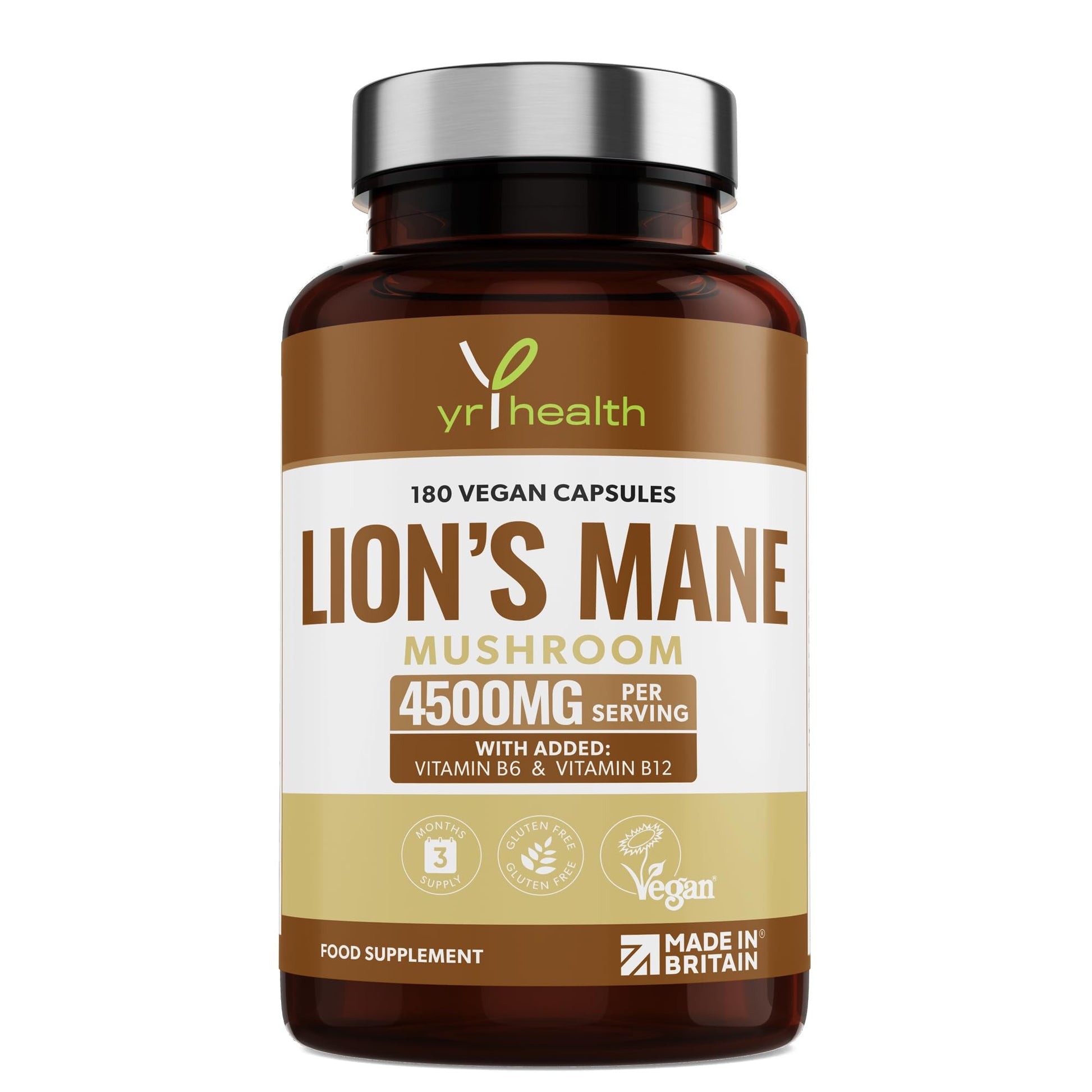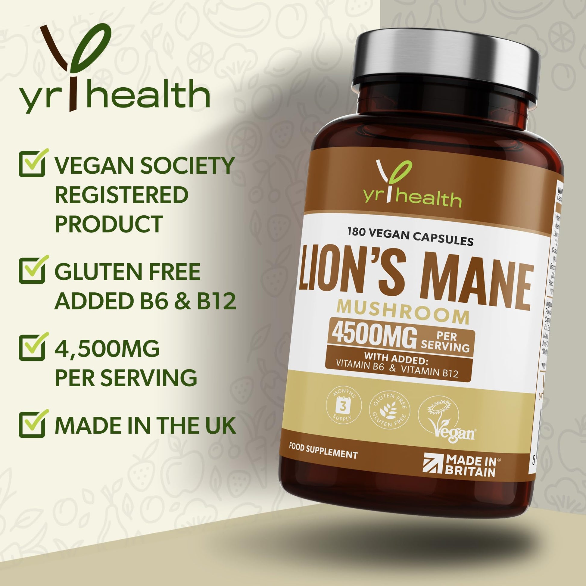 yrhealth Lion's Mane Mushroom Supplement 4500mg - 180 Vegan Capsules with Added Vitamin B6 & B12, Supports Immune System & Promotes Digestive Health - 3 Months Supply - Made in The UK by YrHealth