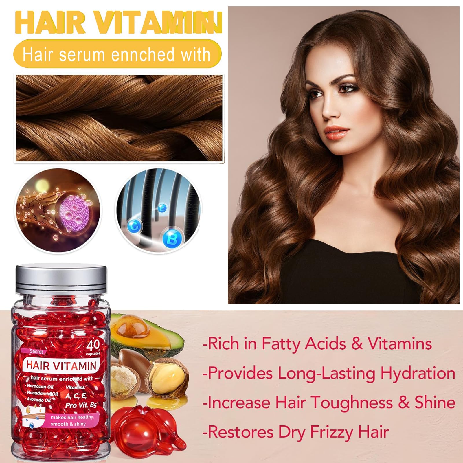ZhongShuang 40 Pcs Hair Vitamin Serum Capsule Hair Vitamins Hair Serum, Enriched with Moroccan Oil, Macadamia Oil, Avocado Oil Makes Hair Smooth and Shiny