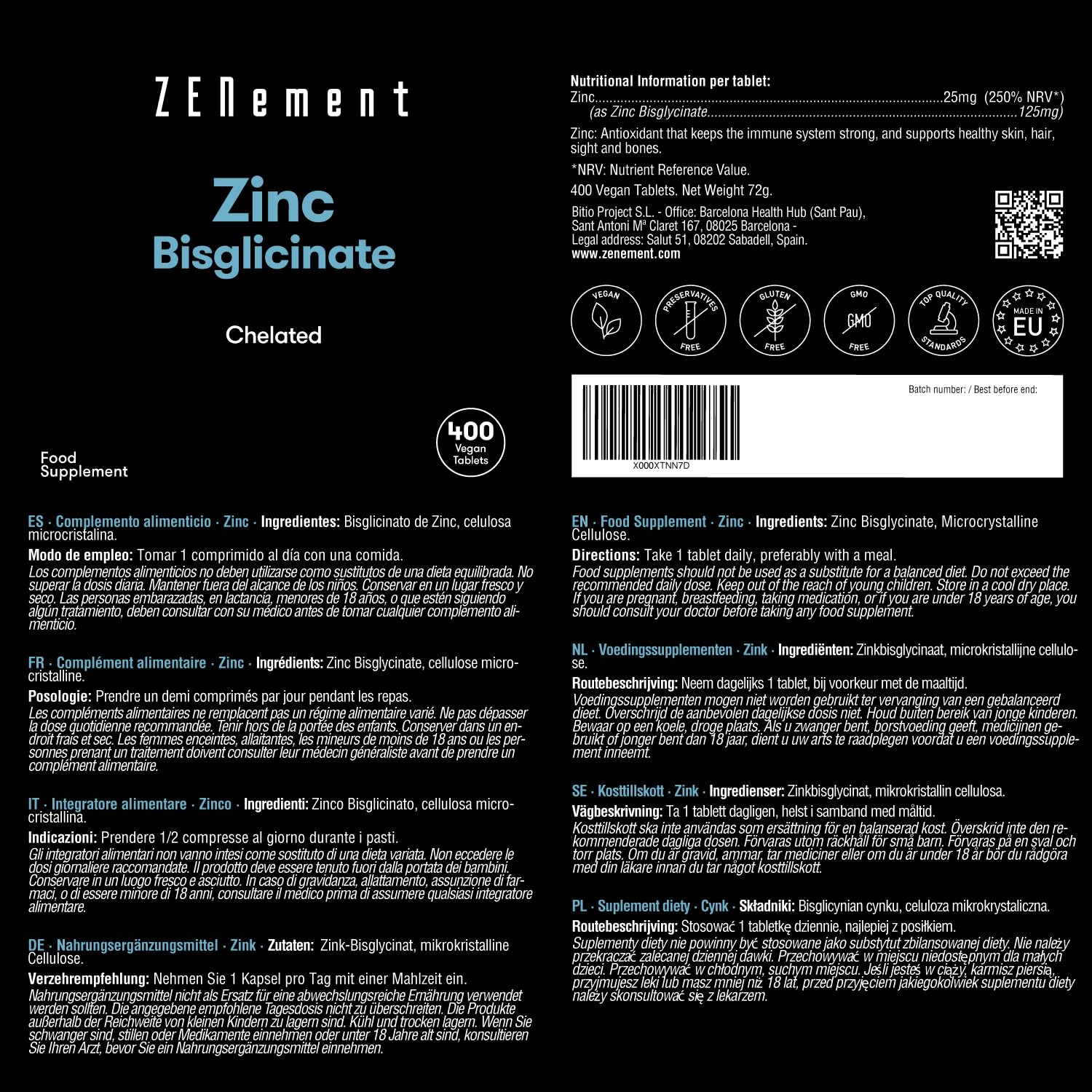 Zinc, 25mg (Bisglycinate), 400 Tablets | Chelated | Antioxidant, Supports The Immune System, Skin, Hair and Eyesight | Vegan | Zenement