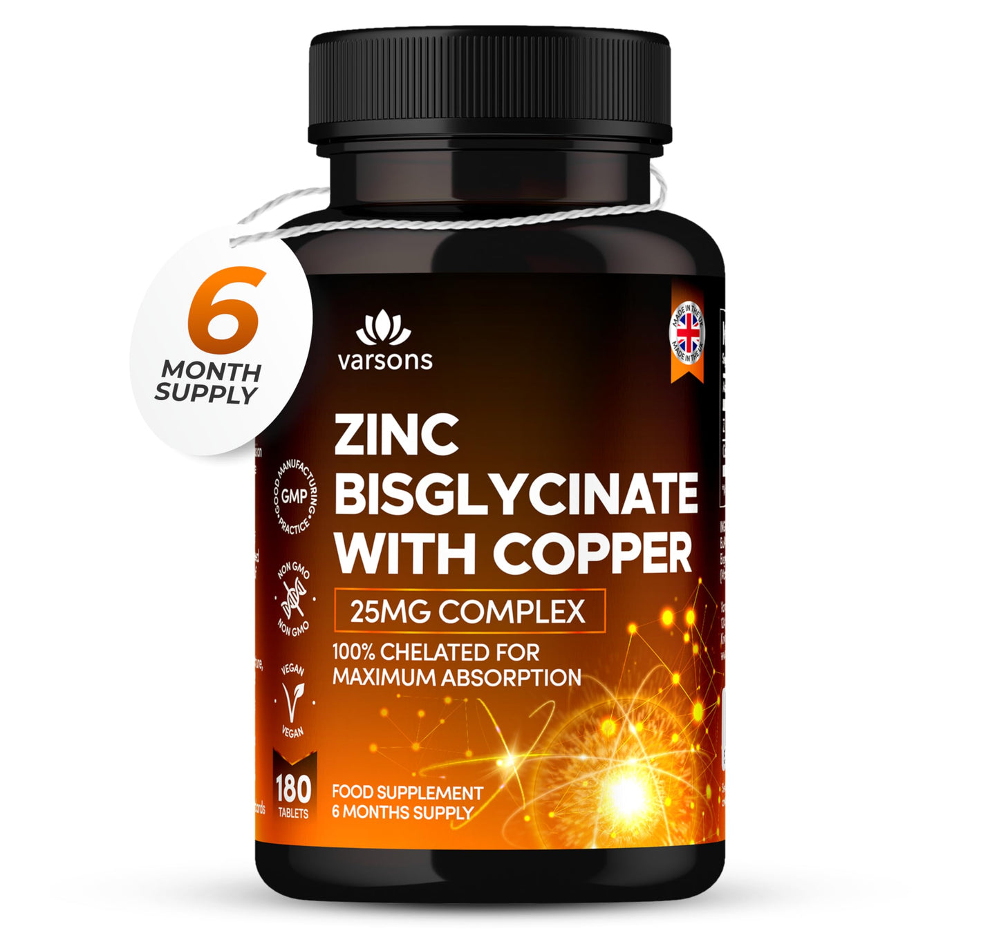 Zinc Bisglycinate 25mg with Copper, 6 Months Supply - Fully Chelated, Contributes Towards Immunity Support, Bones, Hair, Skin & Nails, Suitable for Vegans, Made in The UK