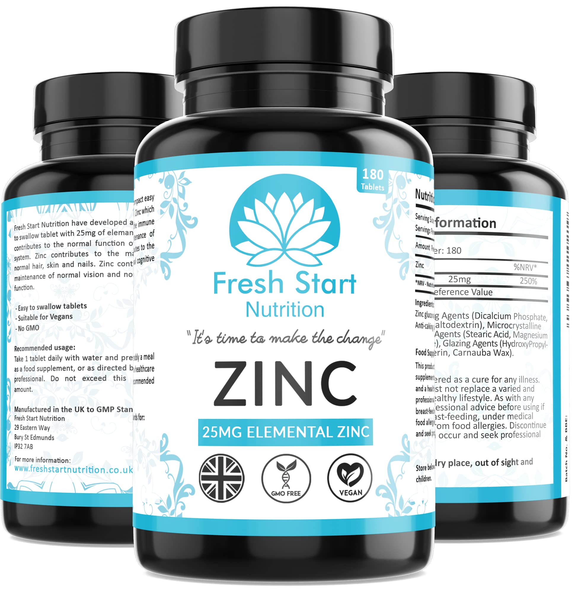 Zinc Tablets 25mg – Zinc Tablets High Strength for Maintenance of Normal Immune System, Hair, Skin, Nails & Bones Zinc Supplements - 180 Vegan Tablets – Made in The UK by Fresh Start Nutrition