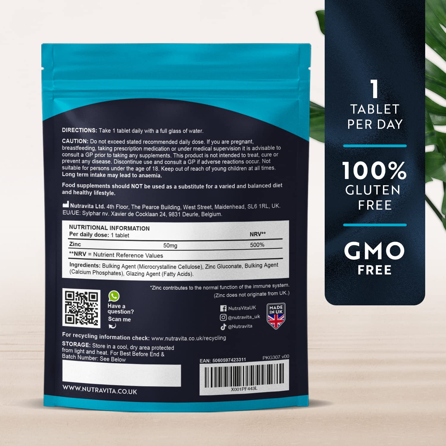- ✔︎ WHY NUTRAVITA’S ZINC ESSENTIALS? – Each vegan tablet of our Zinc provides 50mg of Zinc, a safe dosage to maintain normal bones, vision, hair, skin, nails and immune system. Claims are substantiated by EFSA. With 120 easy-to-swallow tablets per pouch, you have enough Zinc tablets high strength supplement to last for 4 months. Our Zinc tablets are suitable for both vegans and vegetarians and are absolutely GMO-free.