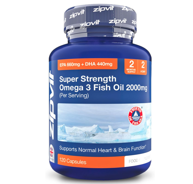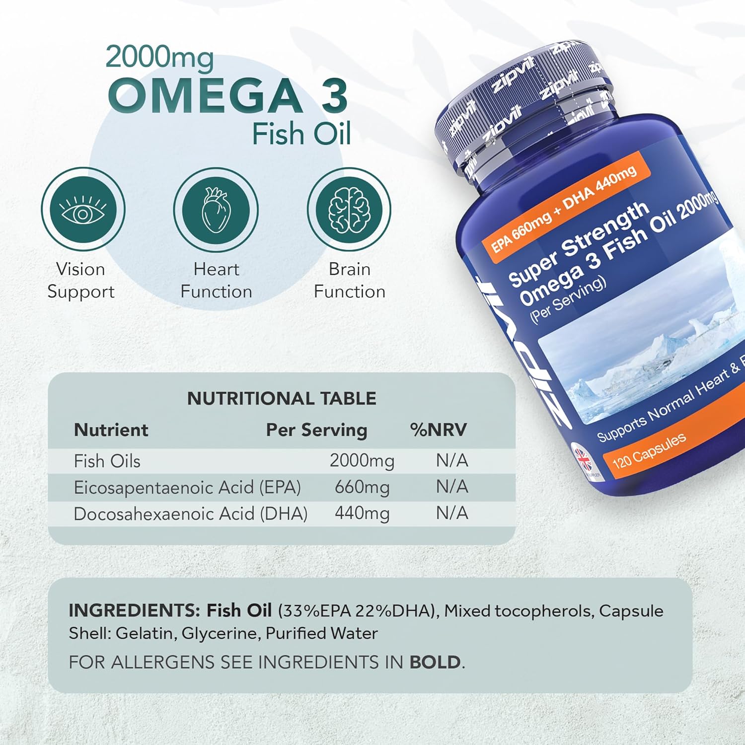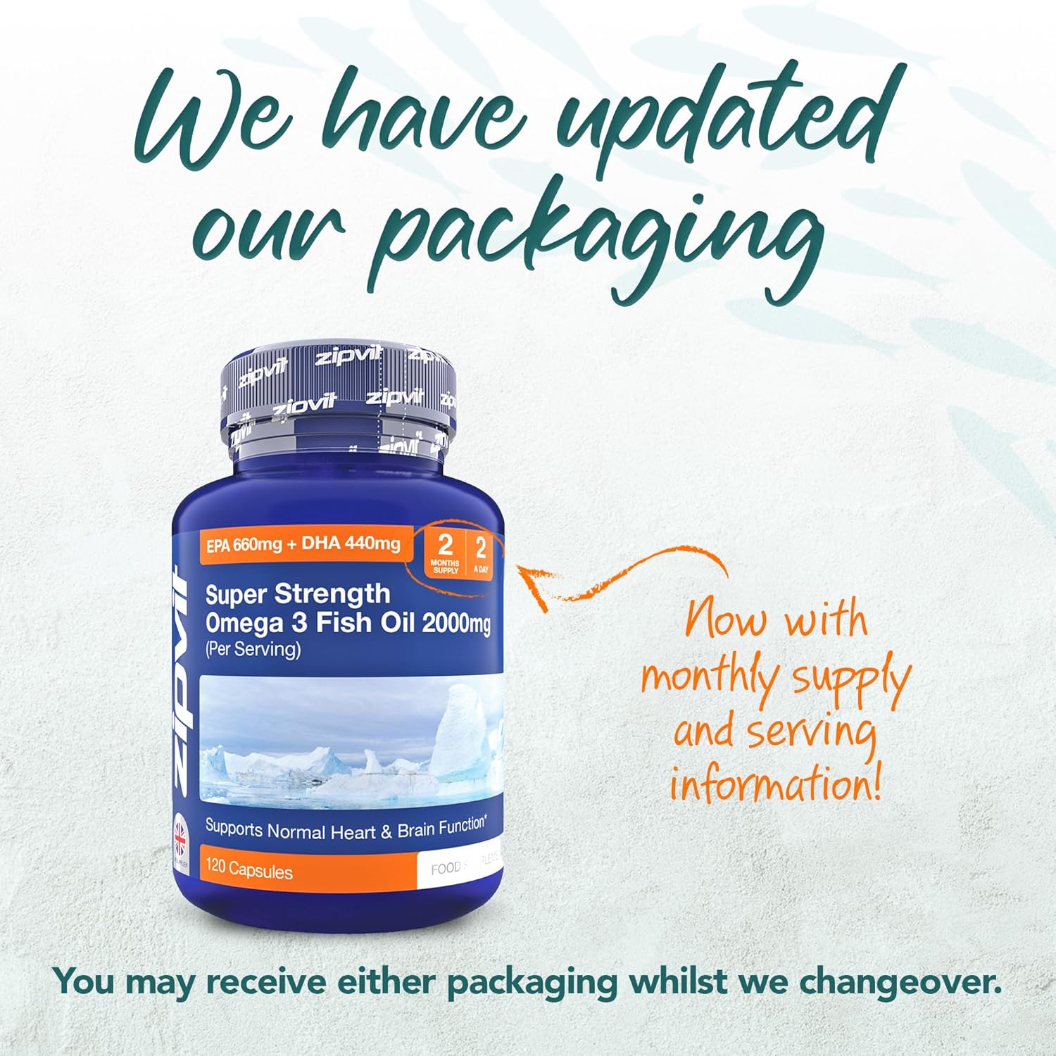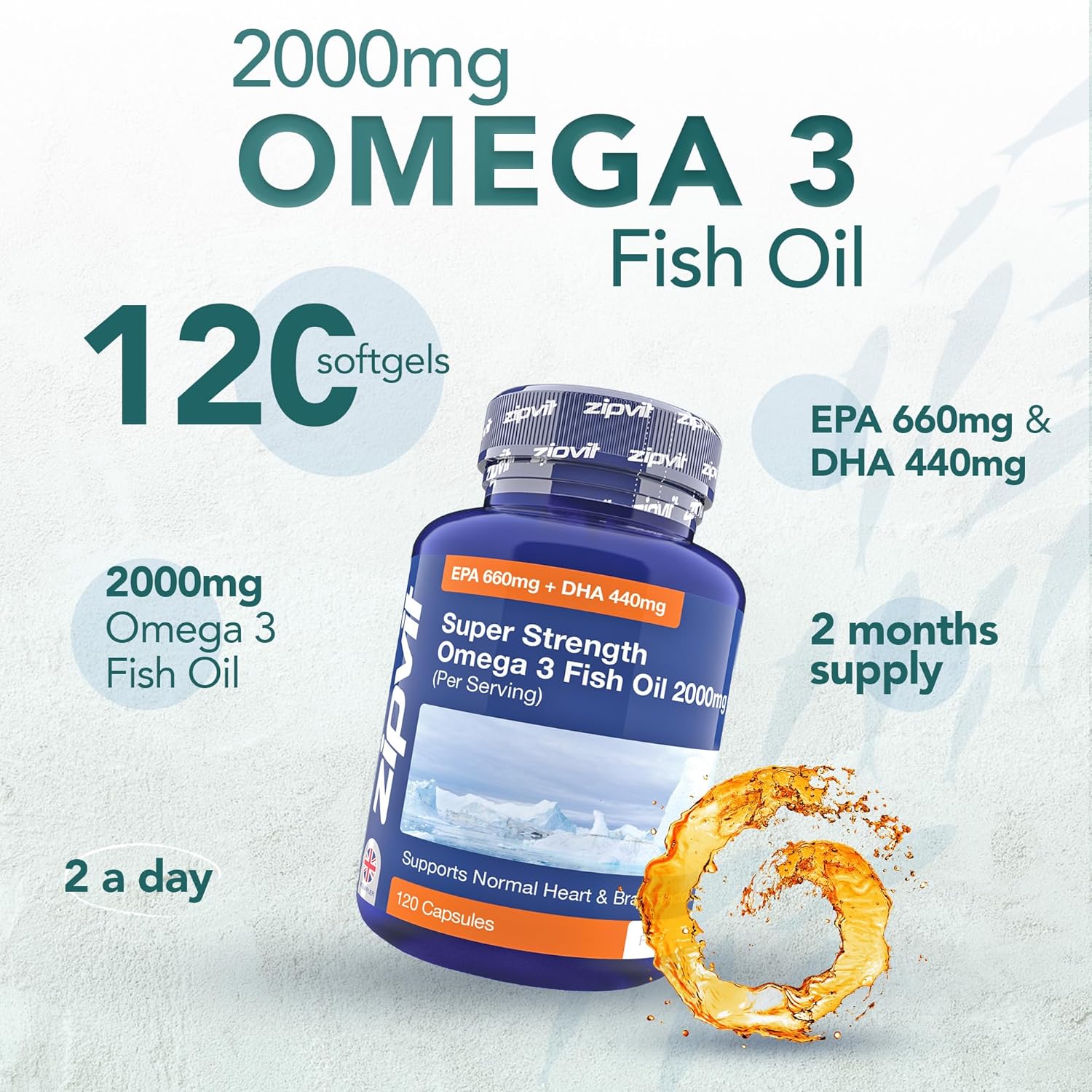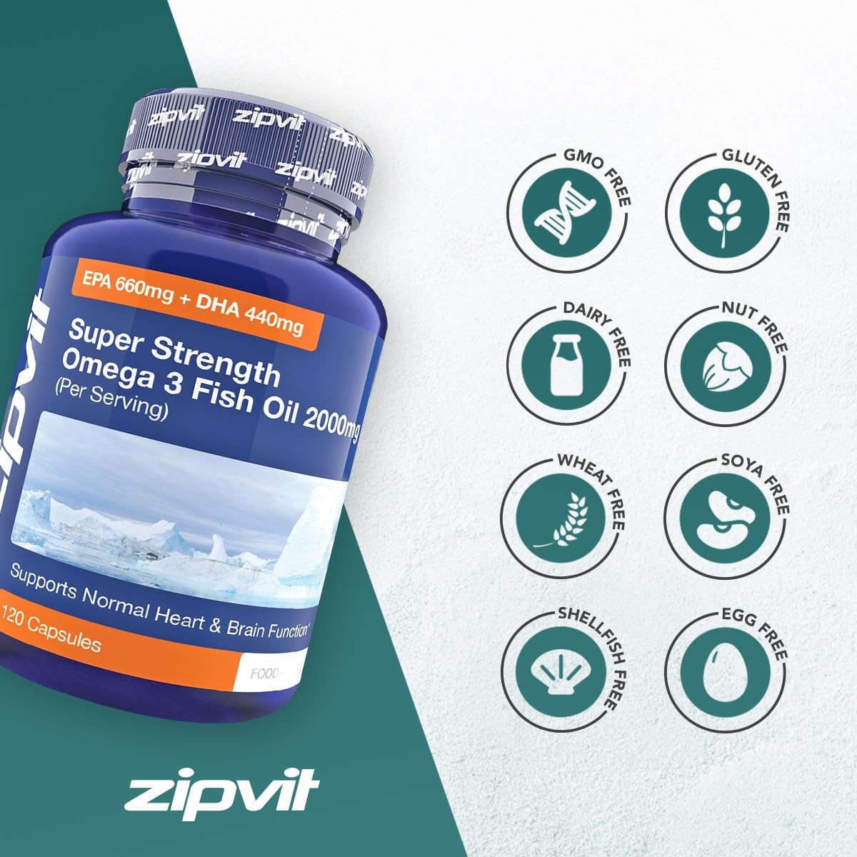 Zipvit Omega 3 Fish Oil 2000mg, EPA 660mg DHA 440mg per Daily Serving. 120 Capsules (2 Months Supply). Supports Heart, Brain Function and Eye Health. 2 Capsules Per Serving